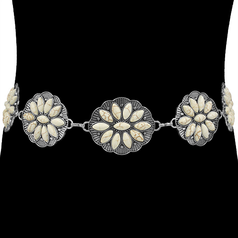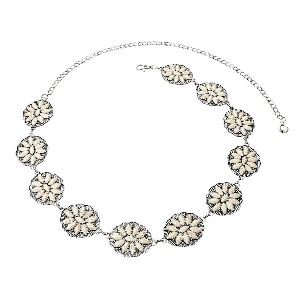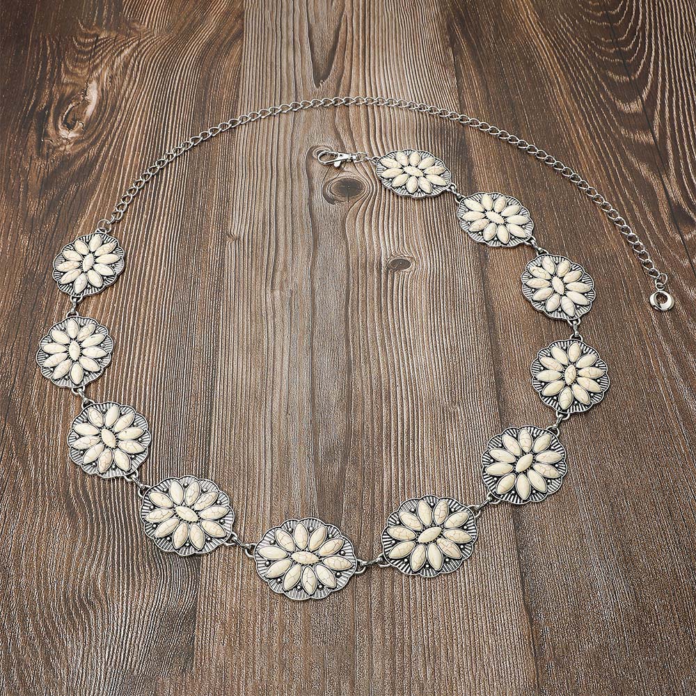 Details • Size : 1.5" H, 30" + 16" L • This elegant floral concho chain waist belt adds a refined touch to any outfit. Featuring bold flower-shaped medallions linked together, it enhances your silhouette with vintage-inspired charm. Perfect for pairing with dresses or skirts, it delivers a chic and confident statement look. • Lead and Nickel Compliant