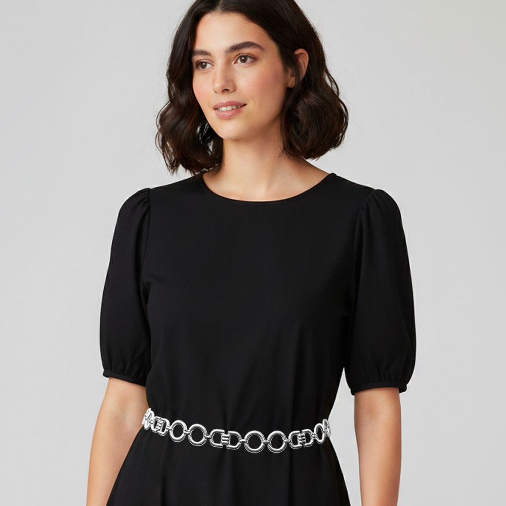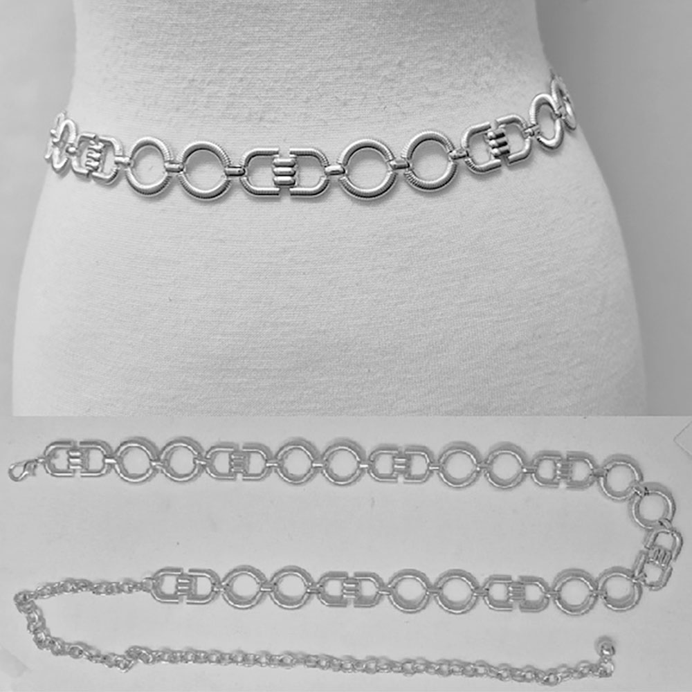 Details • Size : 0.8" H, 28" + 17" L • Elevate your look with this geometric link chain waist belt, designed with bold circular and rectangular links for a statement finish. A versatile piece that pairs effortlessly with dresses or layered outfits, bringing modern edge and timeless elegance to your style. • Lead and Nickel Compliant