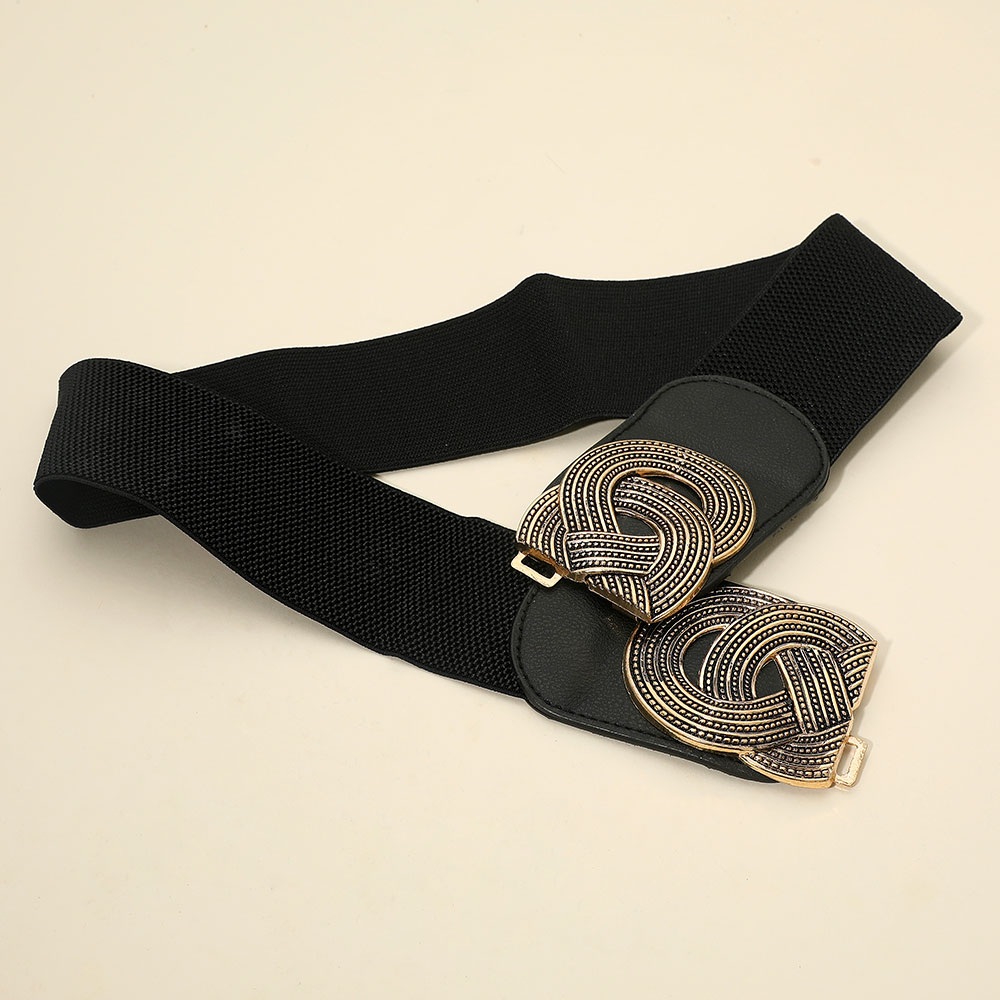 Details • Size : 2.5" H • Approximately : 30" L, Stretchable • Chic wide statement belt featuring an elegant interlocking circle buckle with intricate detailing. Perfect for styling with dresses, jumpsuits, or blazers, this versatile accessory cinches the waist while adding a polished and fashionable finishing touch. • Lead and Nickel Compliant