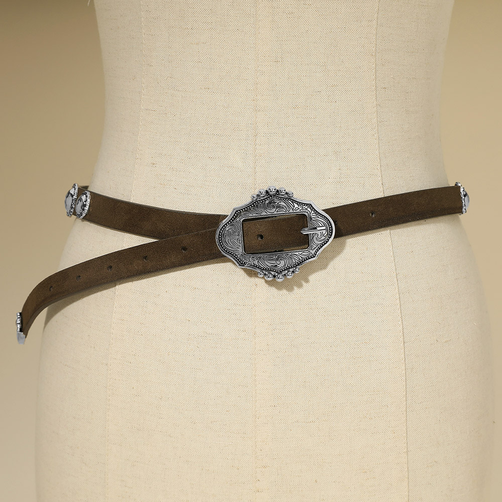 Details • Adjustable 28" - 37" L • Approximately 2.2" H X 42" L • Material : 100% PU • Elevate your outfit with this western style belt featuring an engraved vintage buckle and adjustable fit. Perfect for adding a bold touch to dresses, jeans, or casual looks, this statement accessory blends classic western charm with versatile everyday style. • Lead and Nickel Compliant