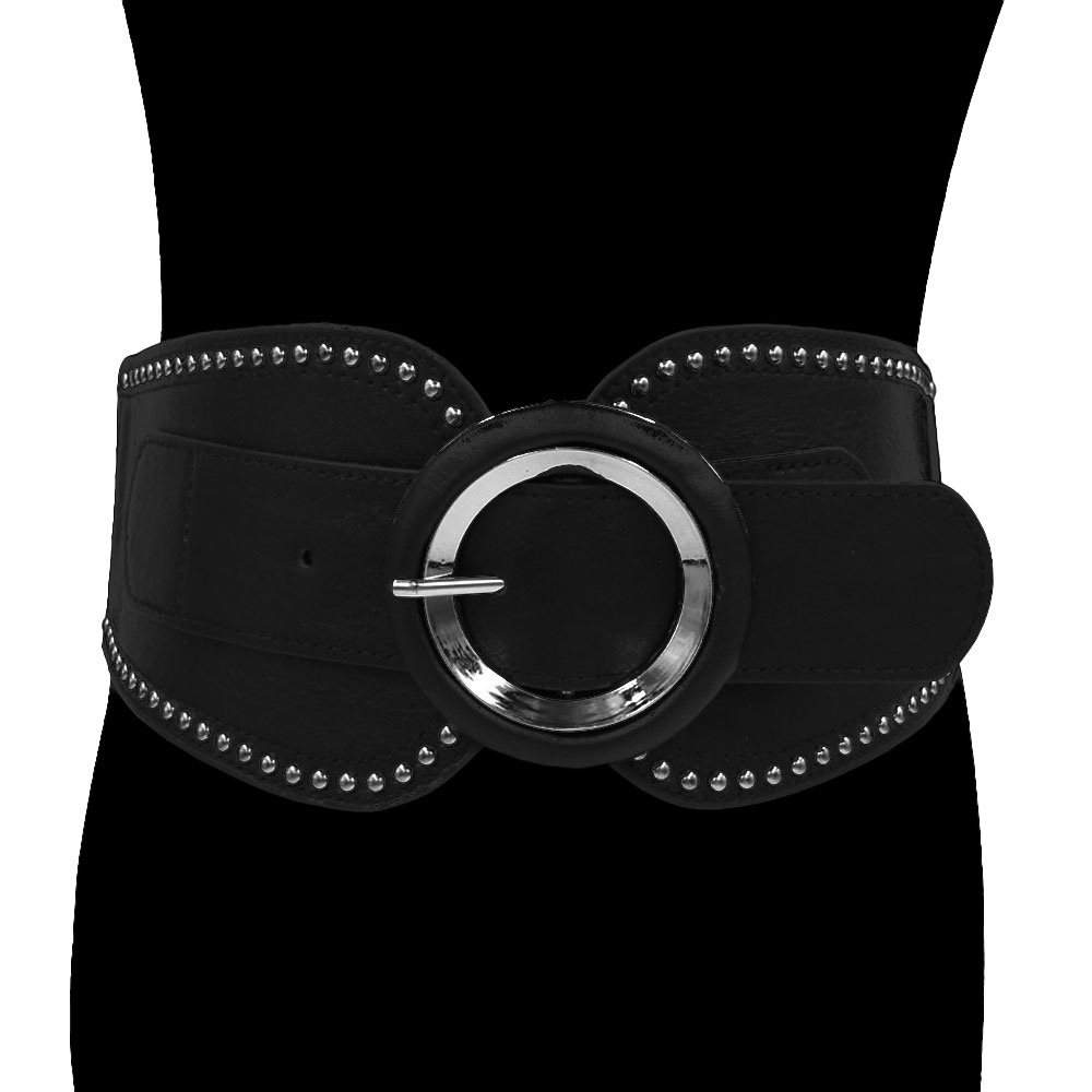 Details • Size : 4.3" H, 39" L • Stretchable • This wide circle buckle waist belt makes a bold fashion statement with its structured design and studded detailing. The sleek circular buckle adds modern flair, making it ideal for cinching dresses, coats, or tops. Perfect for creating a flattering and confident silhouette. • Lead and Nickel Compliant