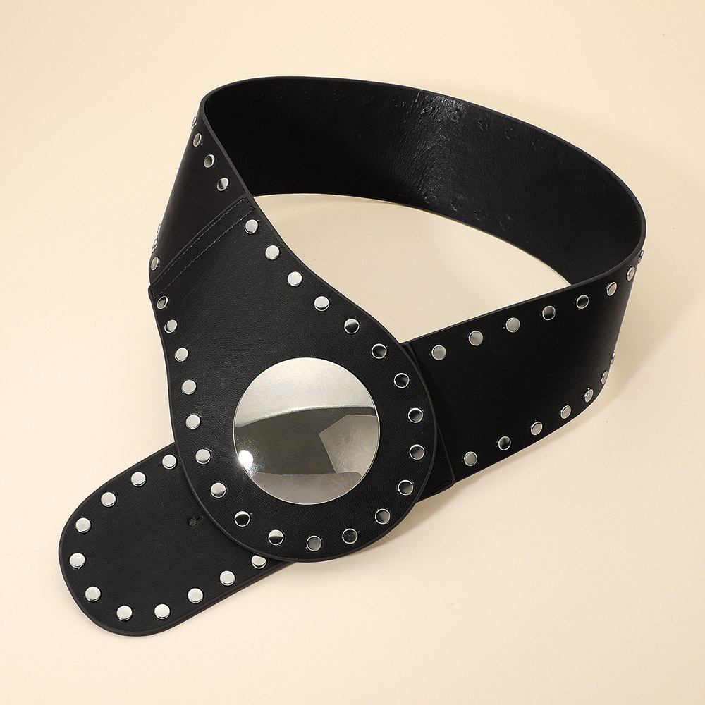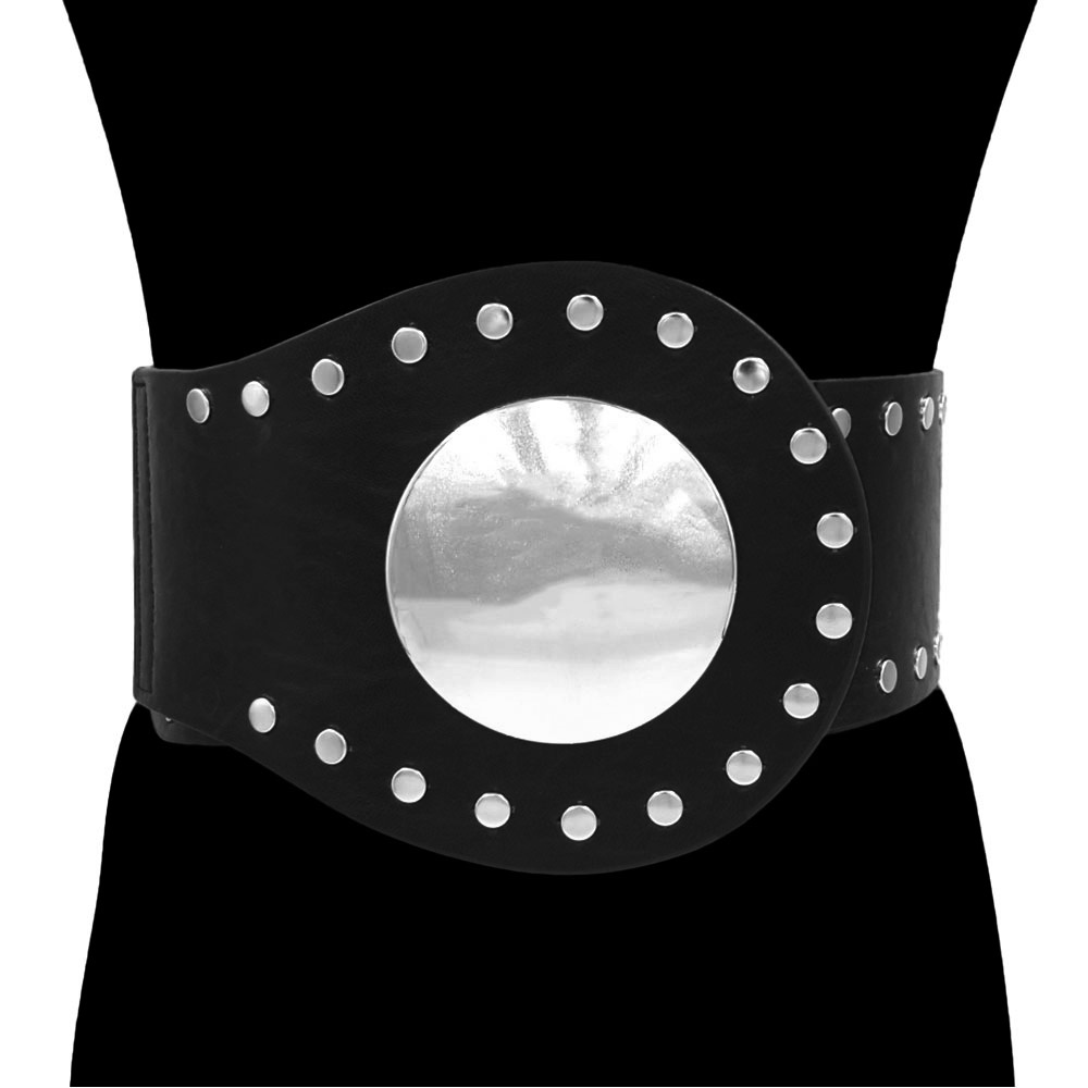 Details • Size : 5" H X 42" L (appx) • Adjustable 34" L - 38" L • This studded wide statement waist belt features a bold circular buckle with metallic accents that command attention. Designed to accentuate the waist with a contemporary edge, it adds a confident, high-fashion finish to dresses or tunics. Perfect for a chic and standout look. • Lead and Nickel Compliant