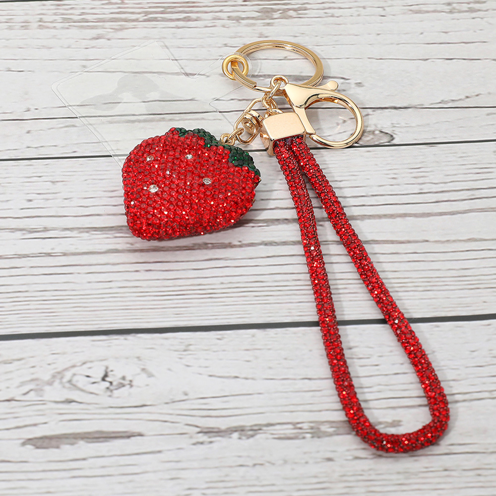 • Fun and stylish strawberry keychain with shimmering rhinestone accents and matching strap. Perfect for adding a playful touch to your keys, bags, or accessories while keeping them secure and easy to carry.