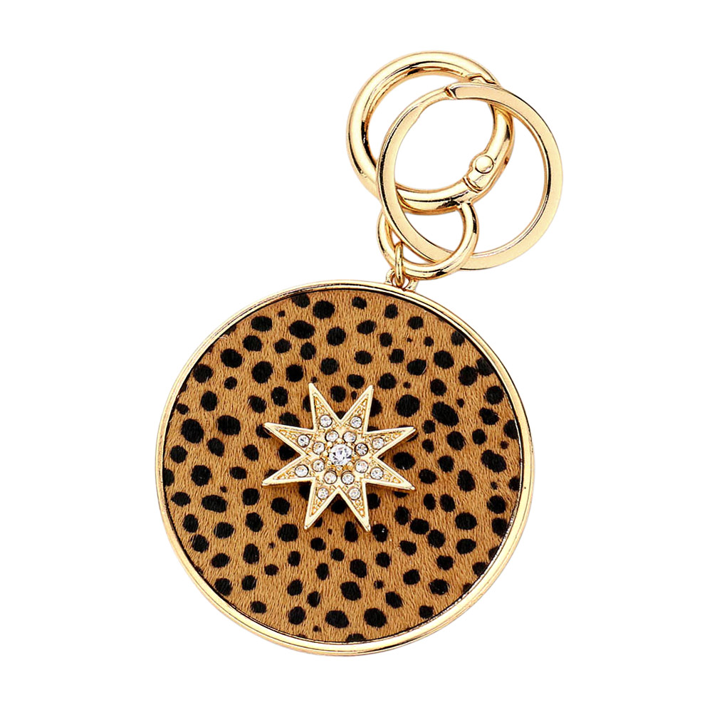Details • Size : 2" X 2" • This round keychain with star embellishment is a chic and practical accessory for keys, handbags, or backpacks. Designed with a bold patterned finish and sparkling detail, it adds personality and style while keeping your essentials secure and easy to carry. • Lead and Nickel Compliant