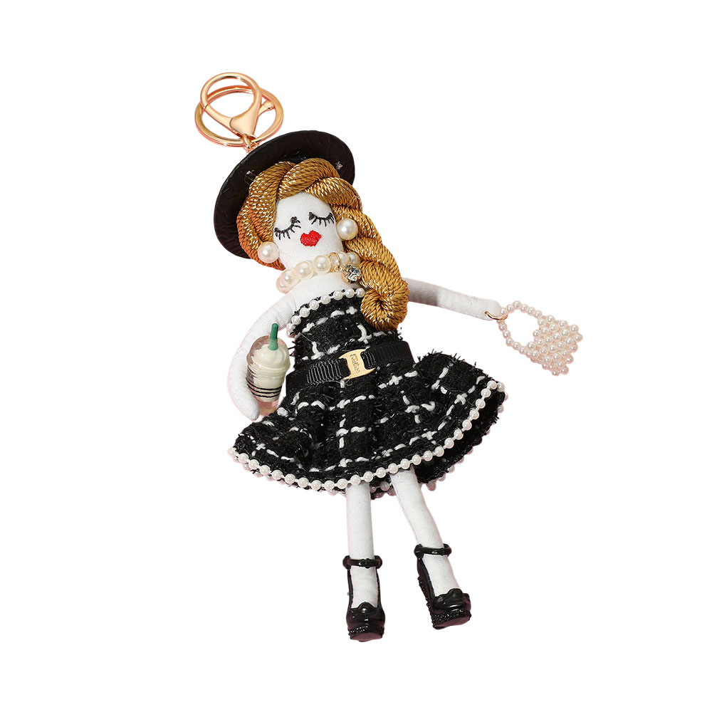 Details • Size : 3.5" X 6.75", 9" L • Stylish doll keychain features a fashion-forward design with a detailed dress, handbag, pearls, and coffee cup. A trendy accessory for bags, keys, or gifts that adds a playful, elegant charm to your look. • Lead and Nickel Compliant