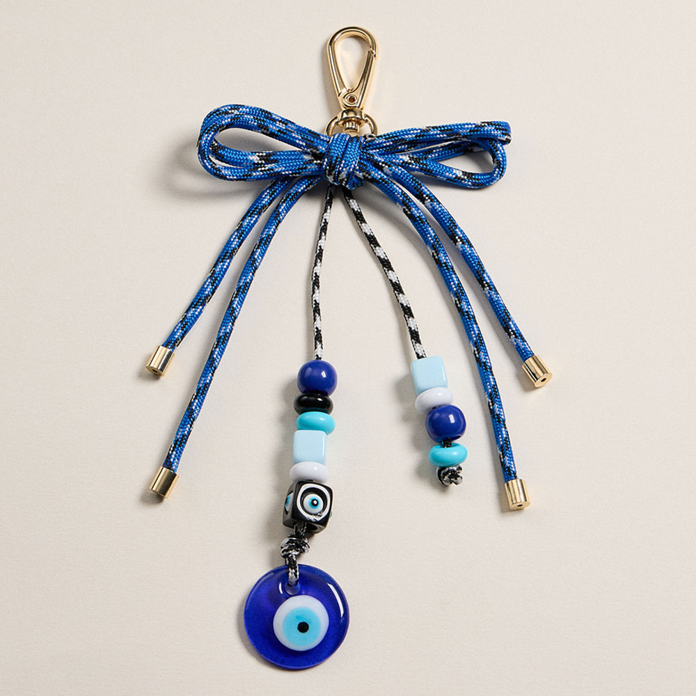 • Stylish keychain featuring evil eye charm and mixed beads, finished with a bow and gold-tone clasp—perfect for bags, backpacks, or key rings. Symbol of protection and good luck.