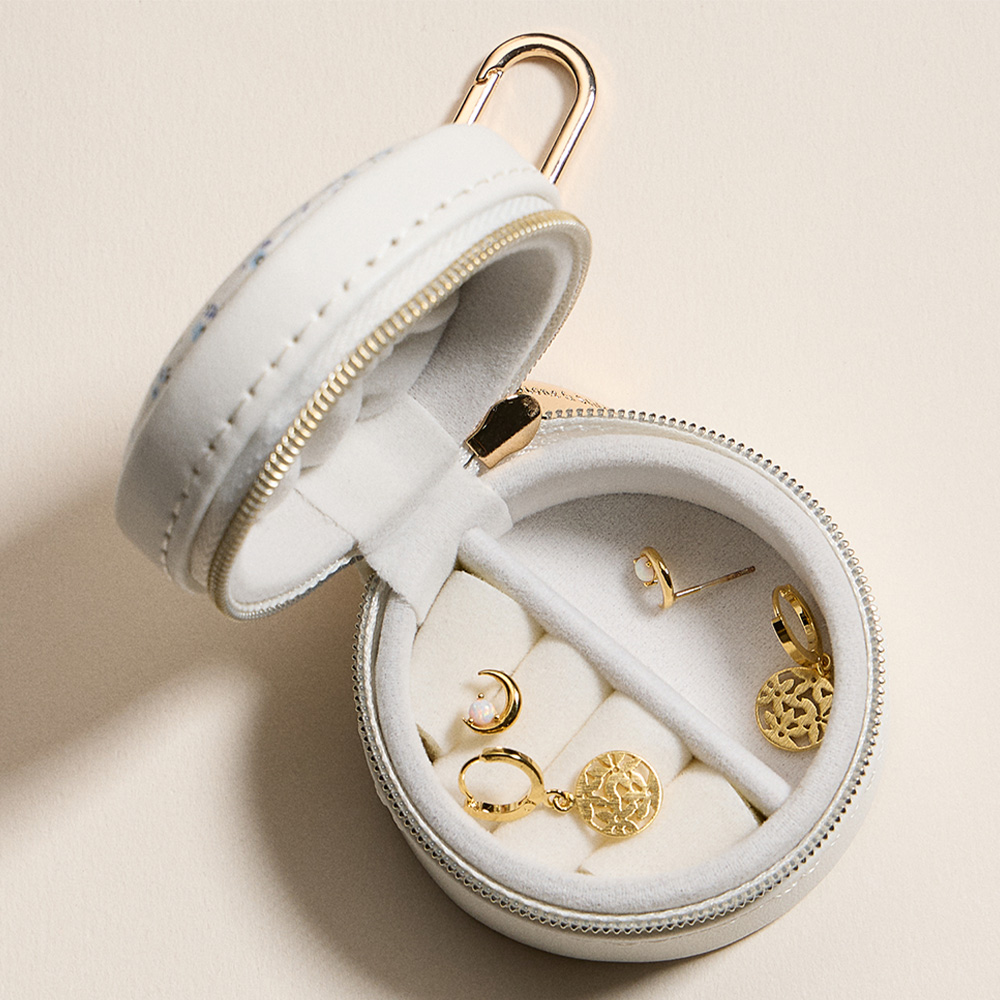 Details • Size : 2.25" X 1.5" • Zipper closure for secure storage • Polished gold-tone keyring with clasp hardware • Compact storage for rings, earrings & small jewelry • Ideal for travel, everyday use, or thoughtful gifts • Keep your jewelry secure with this travel storage case featuring a zipper closure and keychain clip. Its compact design offers dedicated slots for rings, earrings, and necklaces, making it an ideal organizer for travel or daily use.