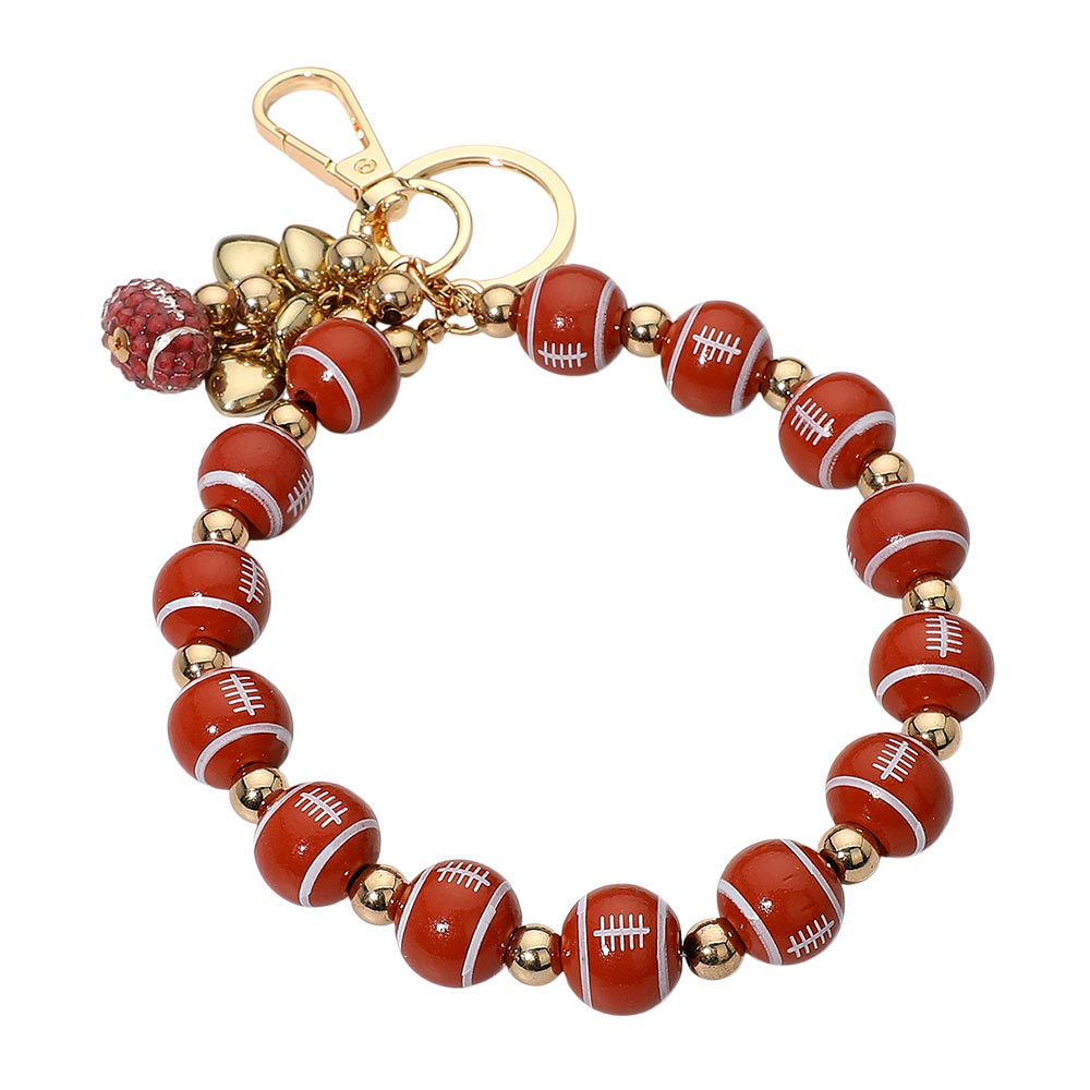 Details • Size : 4" D, 8" L • Sporty keychain bracelet featuring football beads and metallic accents with a stylish clasp and charm detail. Perfect for soccer fans or active lifestyles, this playful accessory adds a fun touch to keys, handbags, or gameday outfits. • Lead and Nickel Compliant