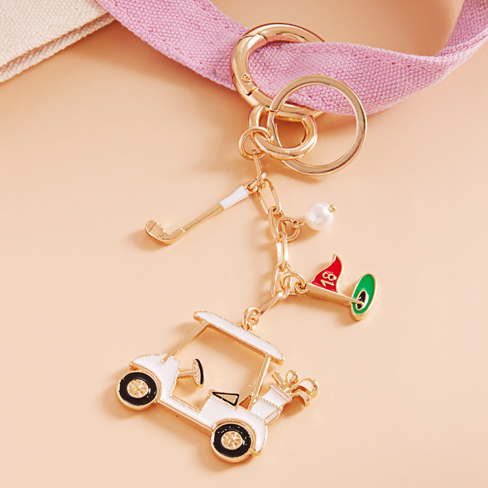 Details • Size : 4.75" L, 2" X 4" • Show off your love for the game with this golf-themed keychain featuring a glittery golf cart charm, mini club, and flag accents. Designed with chic details and a pearl touch, this accessory adds sporty elegance to your keys, bag, or tote—perfect for golf lovers and gift giving. • Lead and Nickel Compliant