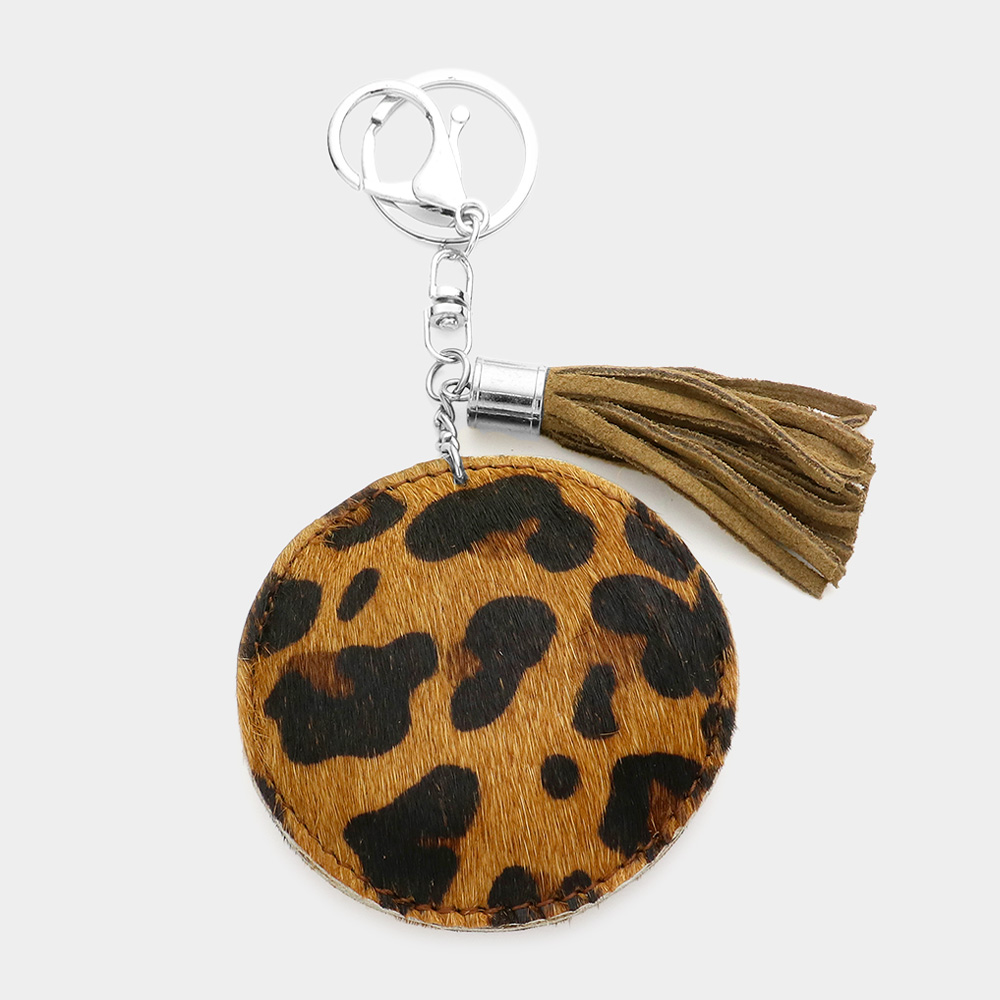 Leopard Patterned Genuine Fur Calf Round Tassel Keychain