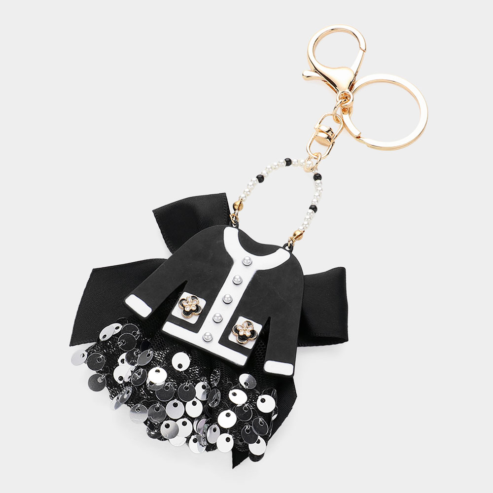 Details • Size : 6.5" L, 3" X 3.75" • Add a touch of chic style with this fashion jacket keychain featuring sparkling sequins, a stylish bow, and beaded handle detail. Perfect as a key holder or bag charm, this trendy accessory makes a fashionable statement while keeping your essentials organized. A unique gift for style lovers.