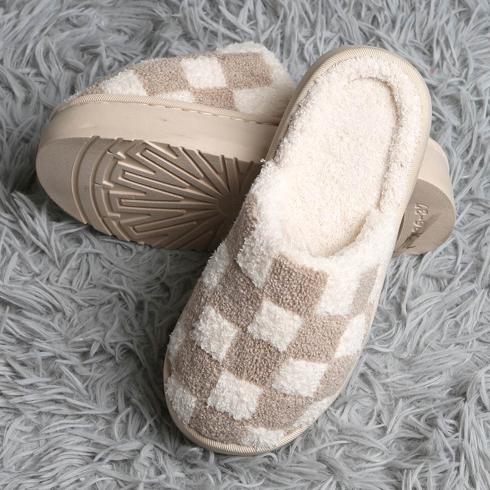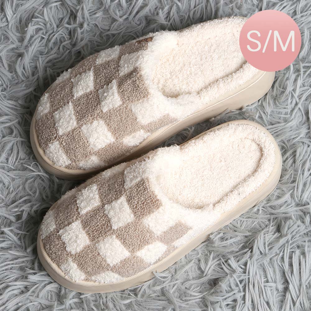 Details • Size : S/M (Women 6-8, Men 5-7) • Material : 100% Poly. Microfiber • Cozy indoor slippers with a trendy checkered design, offering plush comfort and warmth for lounging at home. Featuring a cushioned sole for support and a soft interior for all-day wear, these slippers combine style and relaxation in one perfect pair.