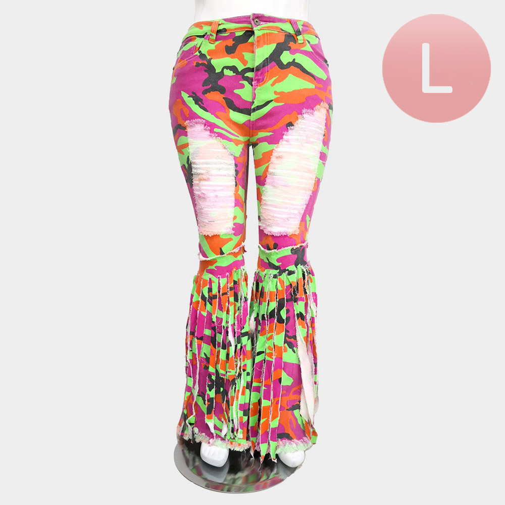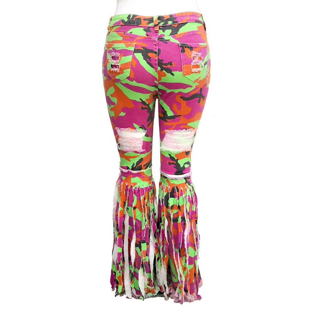 Camouflage Patterned Ripped Tassel Denim Bootcut Jeans