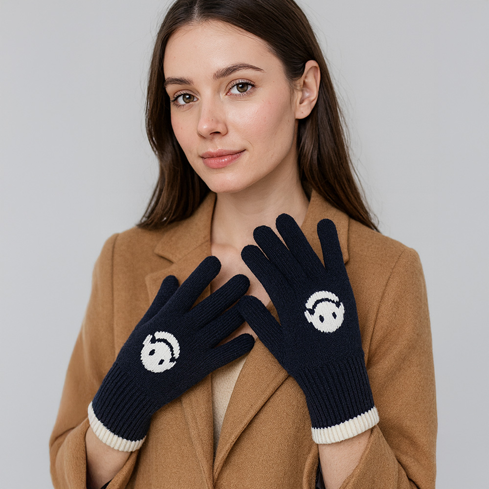 • Playful knit gloves with smiley face design and smart touch technology for effortless device use. Warm, practical, and stylish, these gloves are perfect for adding comfort and personality to your cold-weather outfits.