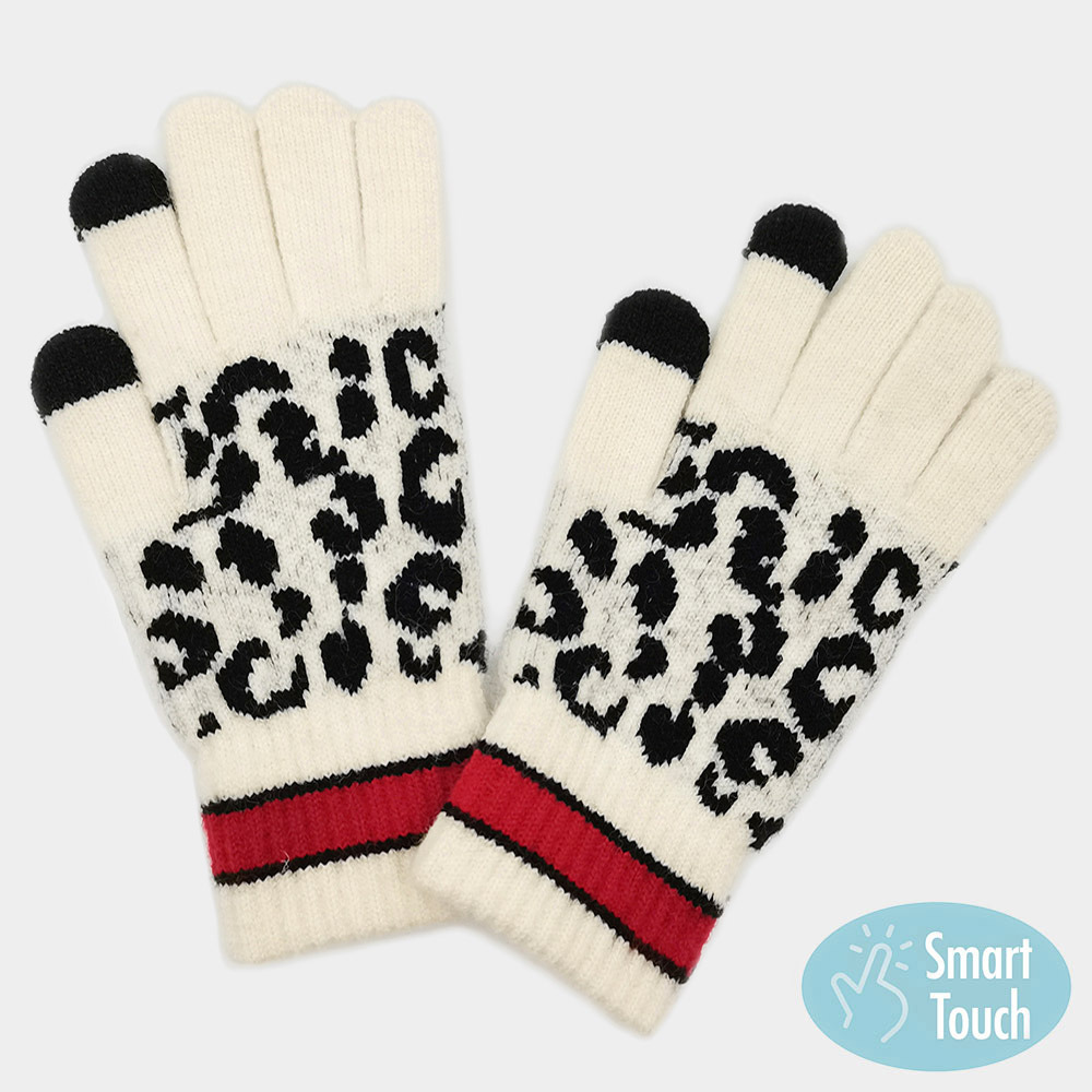 Leopard Patterned Striped Cuff Knit Smart Gloves