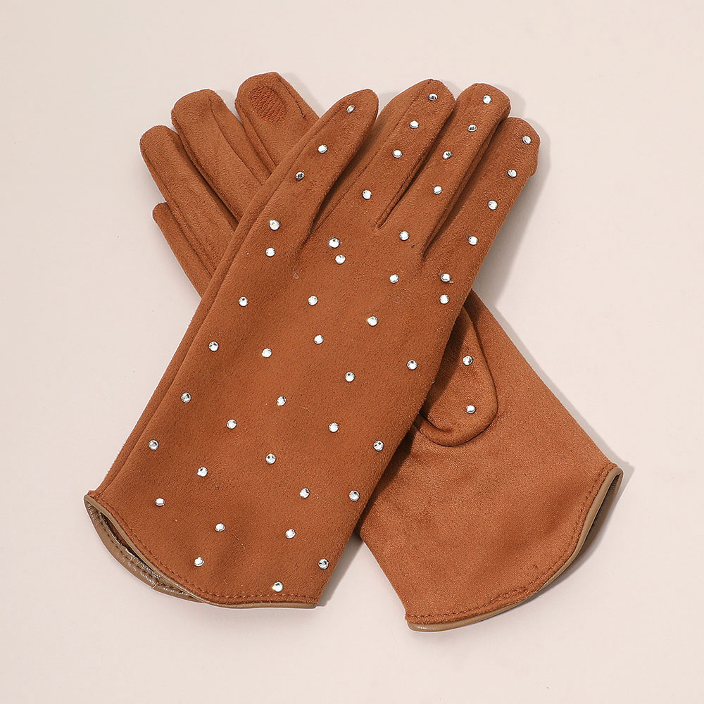 Details • Size : One Size (9" L) • Material : 100% Polyester • Smart Touch • Elegant smart touch gloves adorned with sparkling rhinestones and a sleek trim finish. These stylish gloves combine comfort with functionality, allowing touchscreen use while keeping hands warm and chic — perfect for both casual outings and sophisticated cold-weather looks.