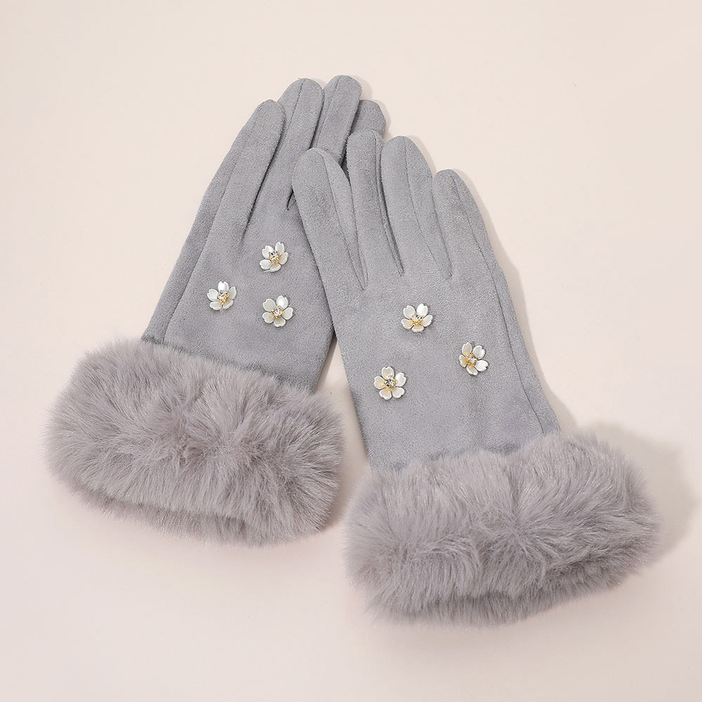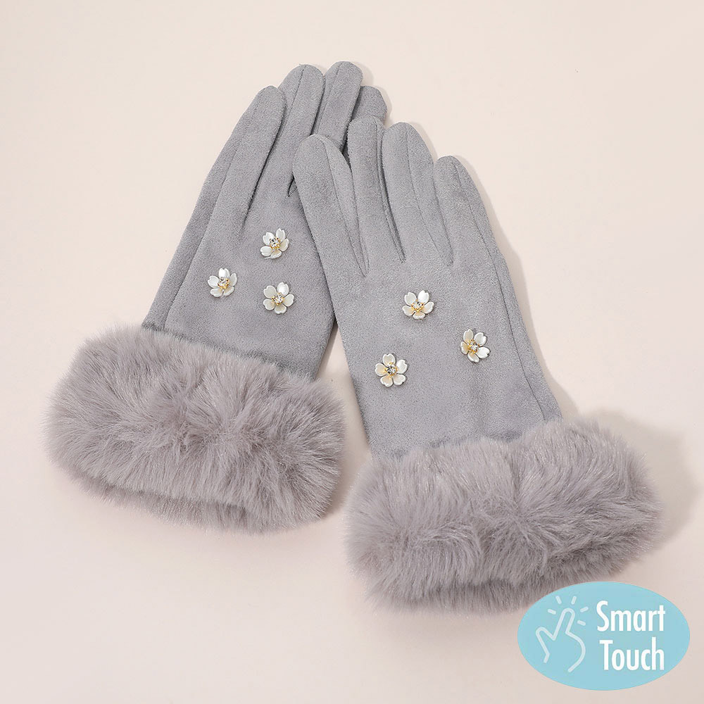 Details • Size : One Size (10" L) • Material : 100% Polyester • Smart Touch • Elegant smart touch gloves featuring faux fur cuffs and delicate floral embellishments for a chic, feminine touch. Designed for comfort and style, these gloves keep hands warm while allowing easy touchscreen use, perfect for everyday wear or adding flair to winter outfits.