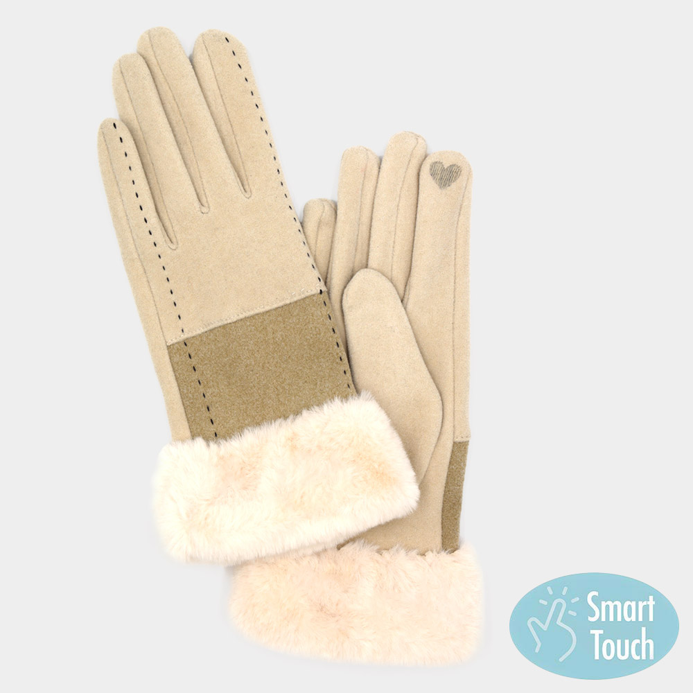 Two Tone And Stitch Lines Faux Fur Cuff Smart Touch Gloves