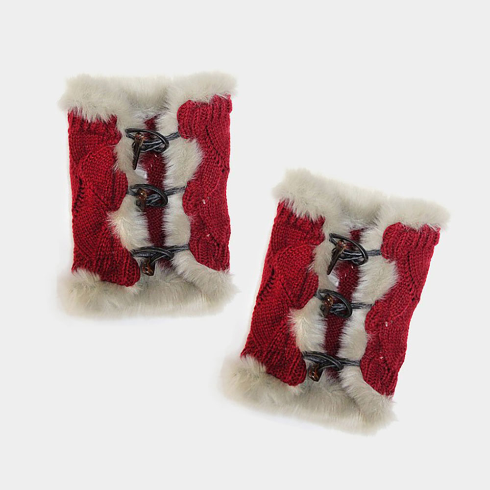 Details • Size : 5" X 8" • Material : Acrylic / Faux Fur • These faux fur knit boot cuff accessories add a cozy, winter-inspired charm to your favorite boots. Featuring a soft knitted pattern framed by plush faux fur trim and toggle accents, they offer both warmth and elegance—perfect for elevating cold-weather outfits with stylish flair.
