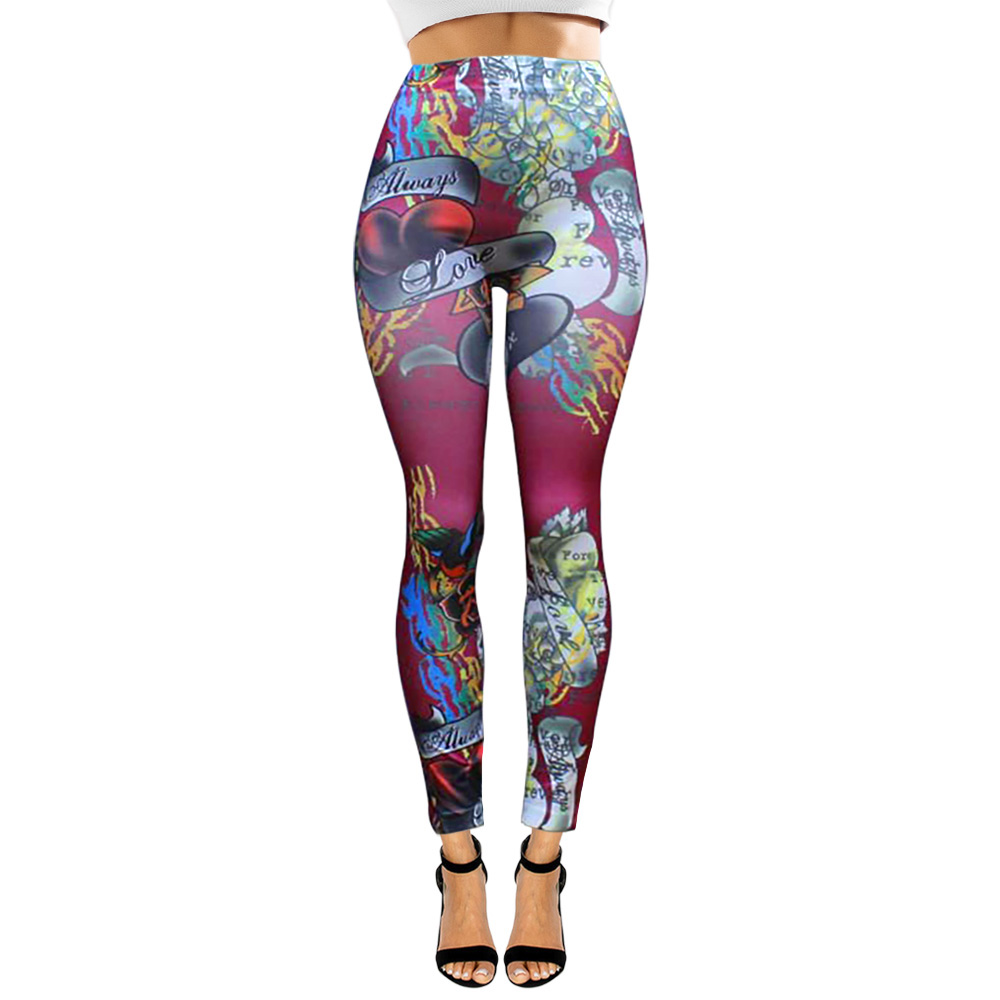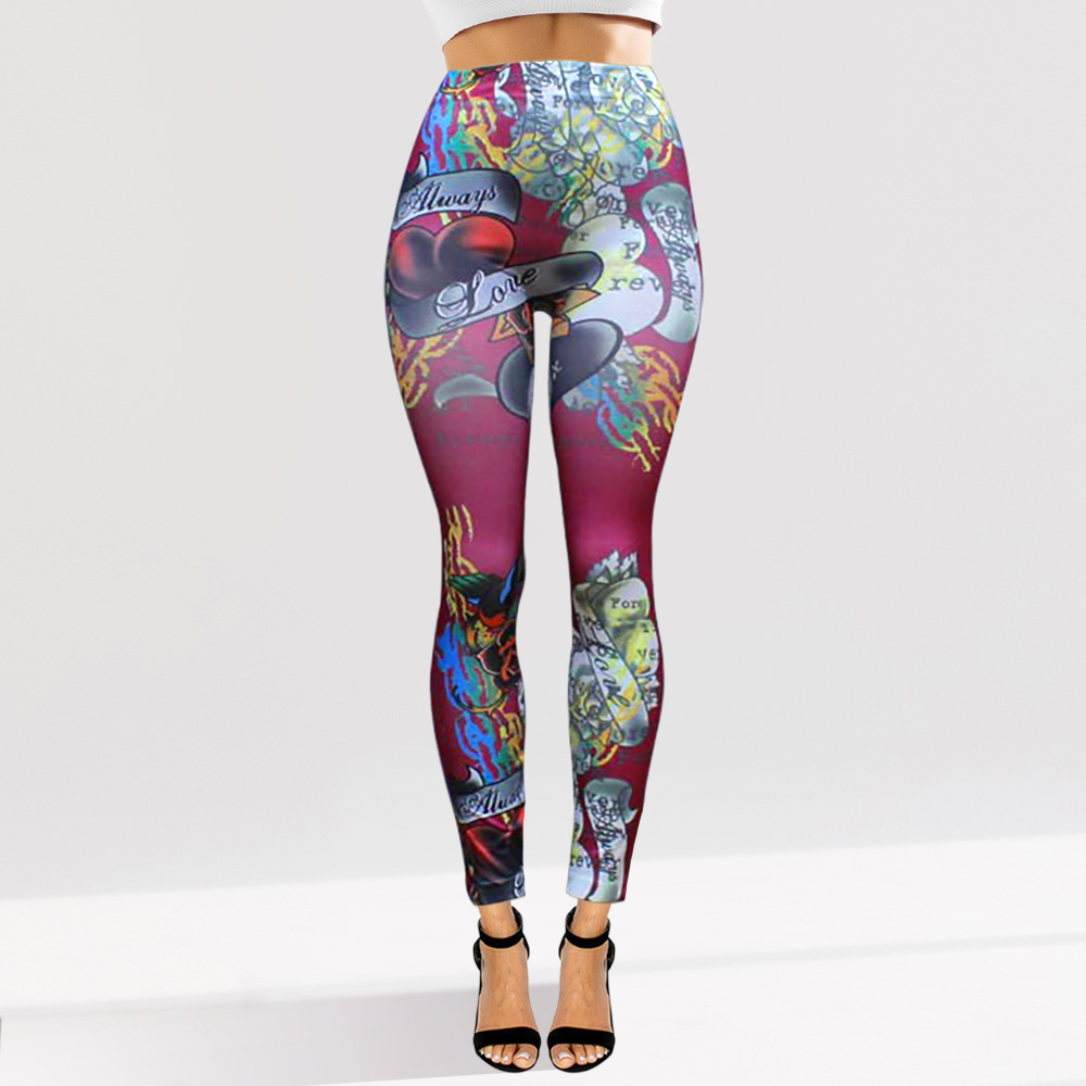 • High-waisted leggings featuring a bold, tattoo-inspired graphic design. Combines edgy style with comfortable stretch fit, perfect for workouts or streetwear fashion. A standout piece for expressive, casual looks.