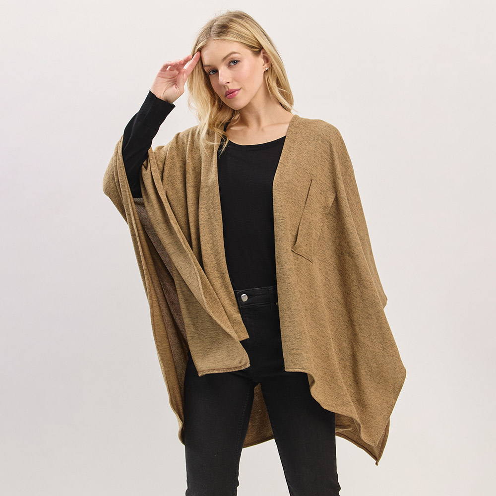 Details • Size : 46" X 28" • Material : 100% Polyester • Elevate your layering with this chic tie-front poncho wrap featuring a draped silhouette and asymmetrical hem. Stylish and cozy, it's perfect for transitional weather, casual days, or adding flair to any outfit.