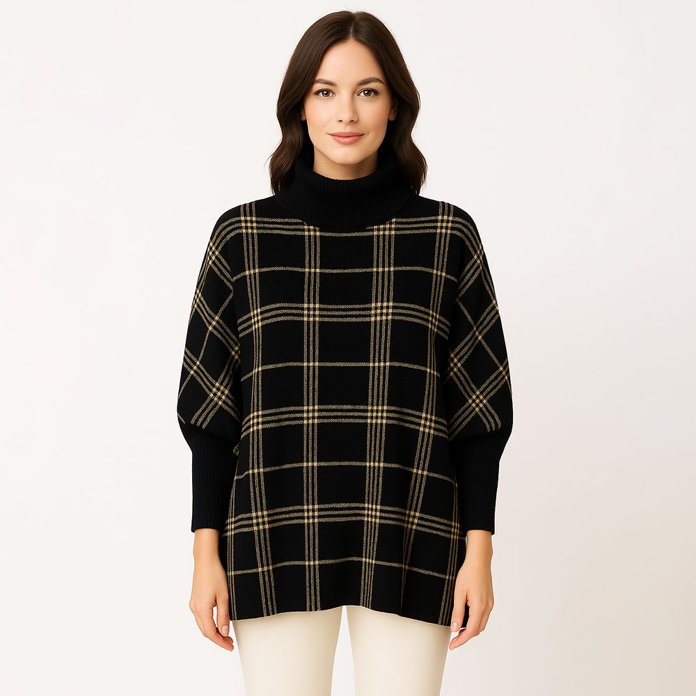 Details • Size : 47" X 30" • Material : 100% Acrylic • Turtleneck poncho sweater with a clean checked pattern, relaxed draped fit, and long ribbed sleeves. A stylish and comfortable layering piece designed for everyday wear, offering a modern look with a soft, easy silhouette.