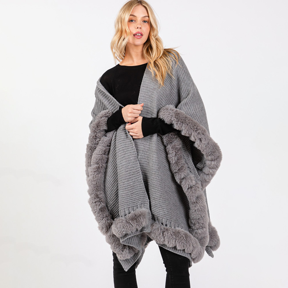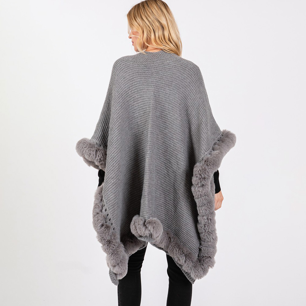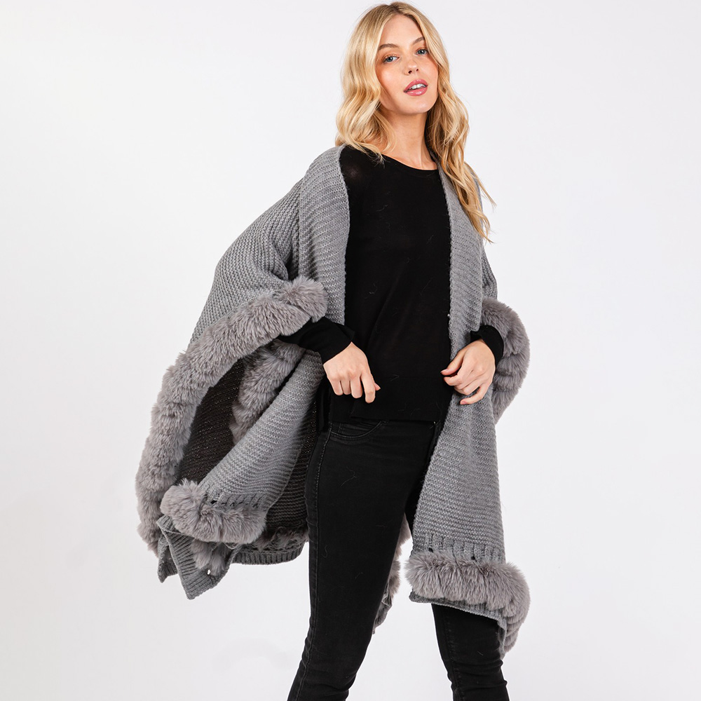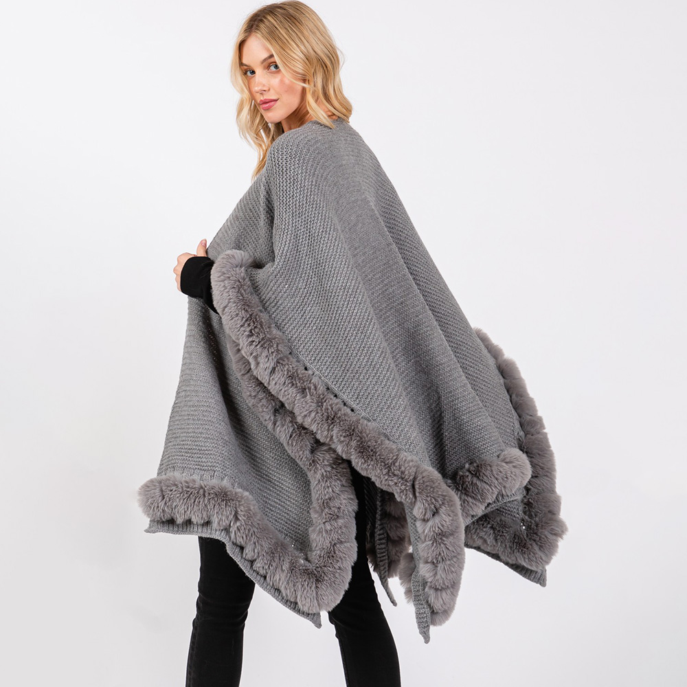 Details • Size : 27.5" X 37" • Material : 80% Acrylic, 20% Polyester • Luxurious knit poncho cape with a plush faux fur trim, offering a cozy yet polished look for chilly days. Its flowing silhouette and textured design provide effortless layering for both casual and dressed-up outfits.