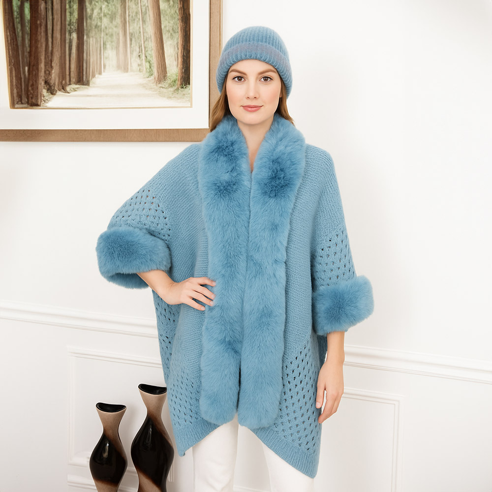Details • Size : One Size • Material : 100% Acrylic • This stylish open-knit cape is accented with soft fur trim along the collar and cuffs, blending cozy texture with refined detail. A versatile layering piece, it drapes gracefully for day-to-night wear, offering warmth, sophistication, and timeless appeal.