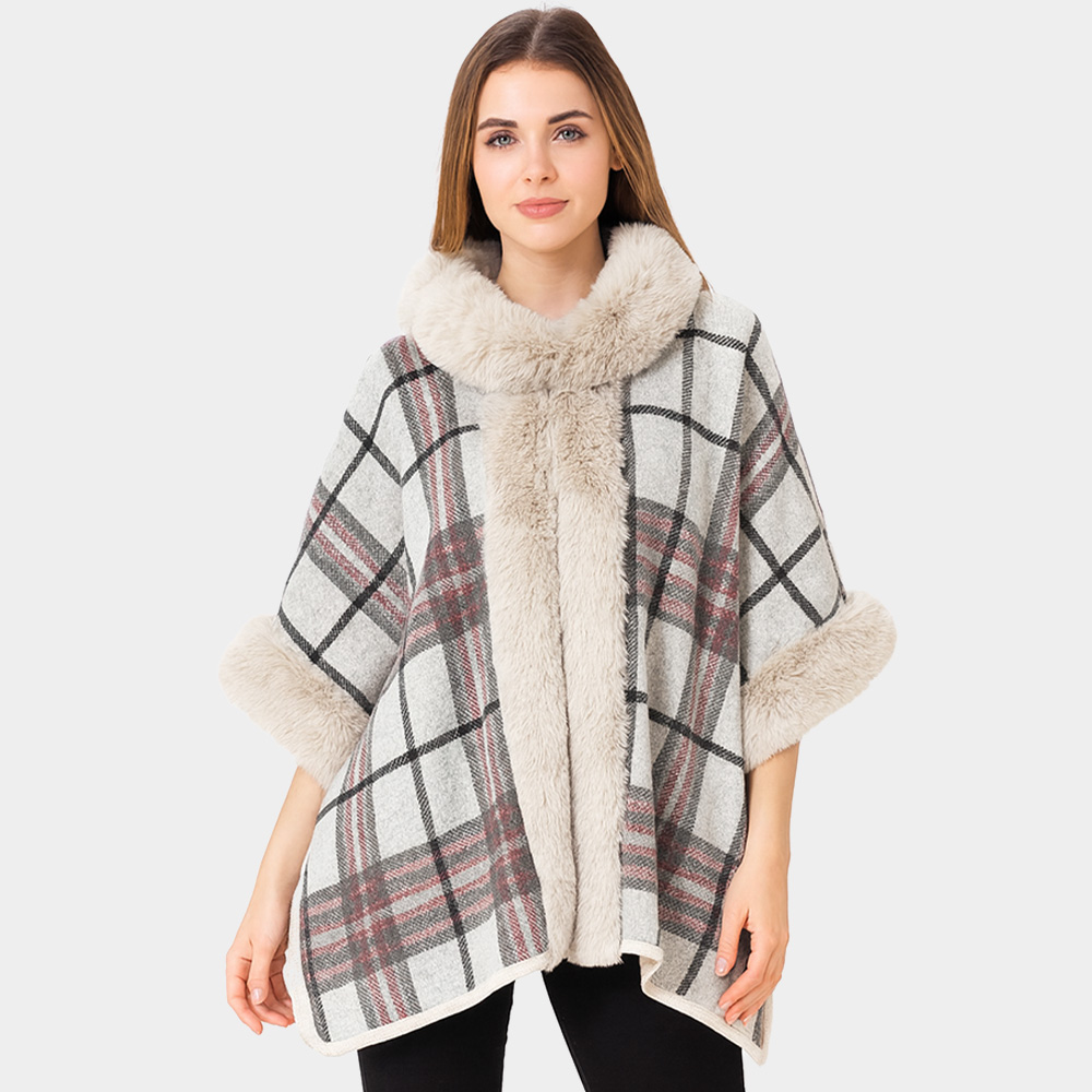 Faux Fur Trim Plaid Check Cape Coat Poncho