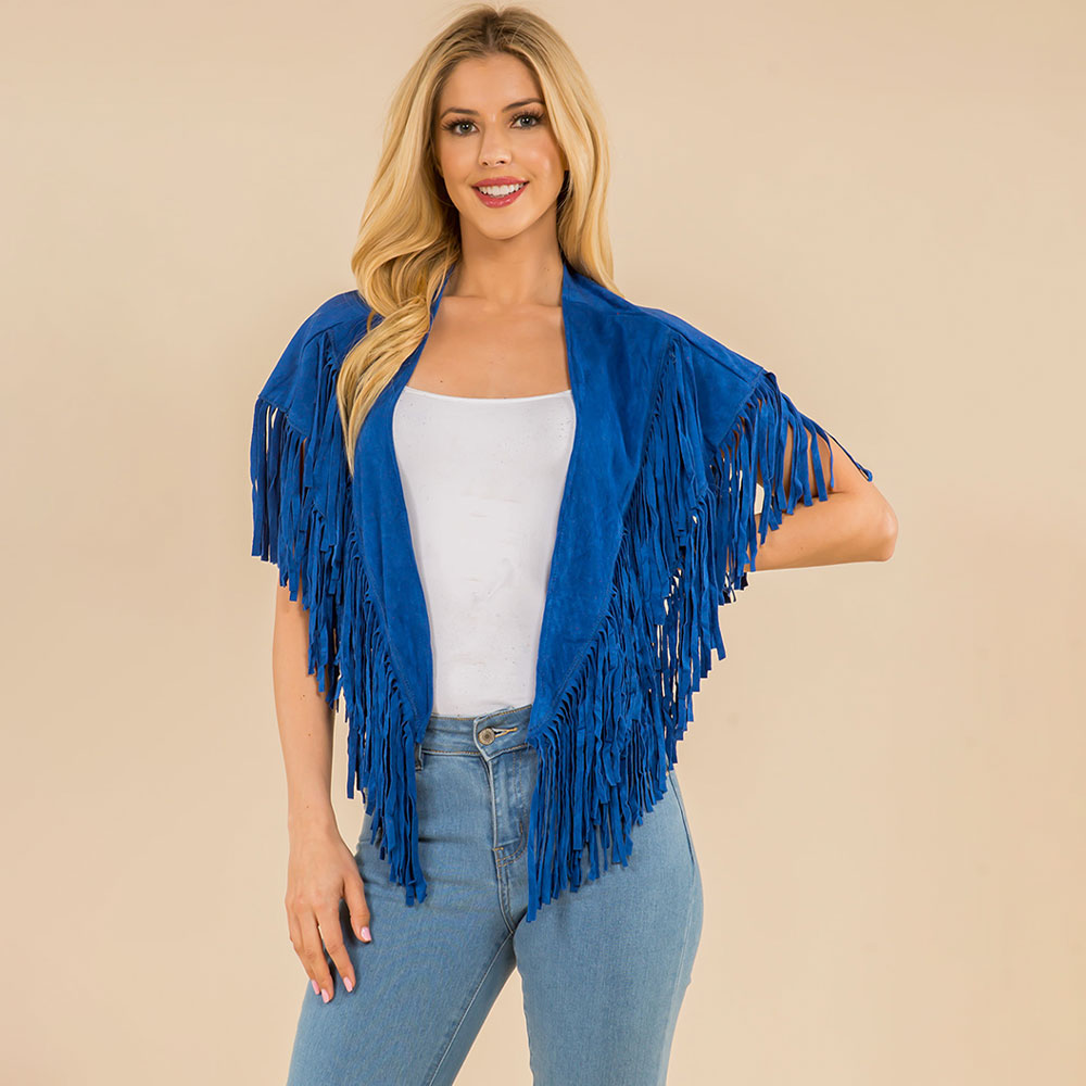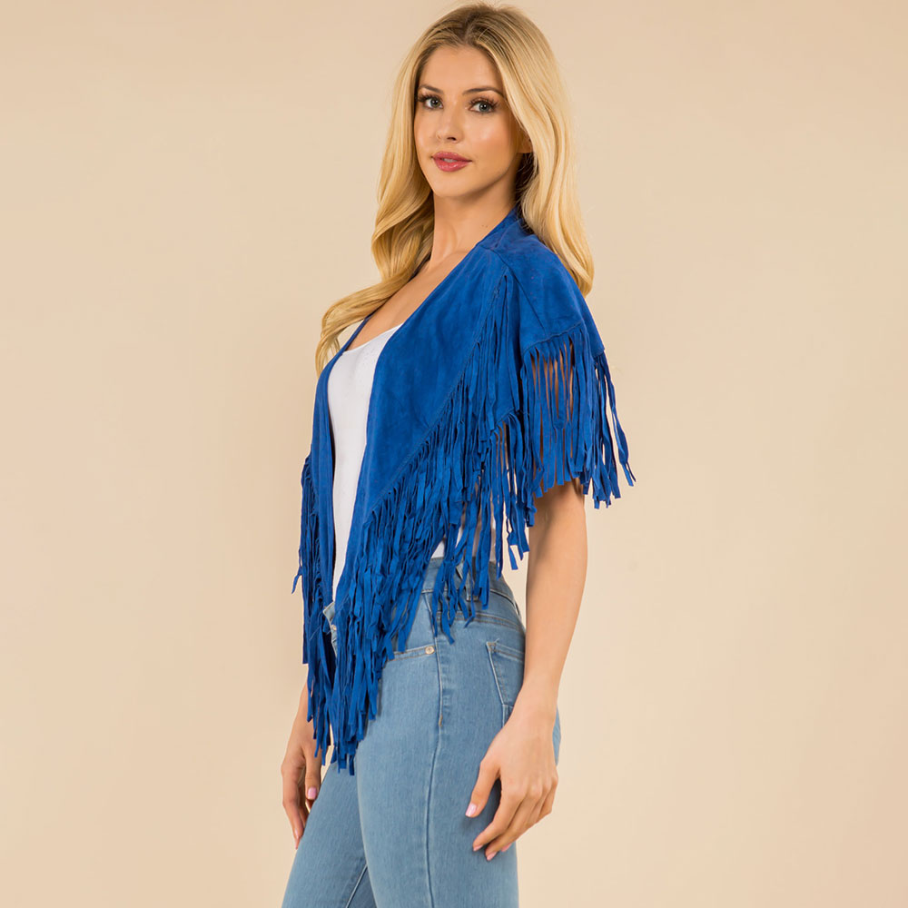 Faux Suede Open Front Western Tassel Shawl Poncho