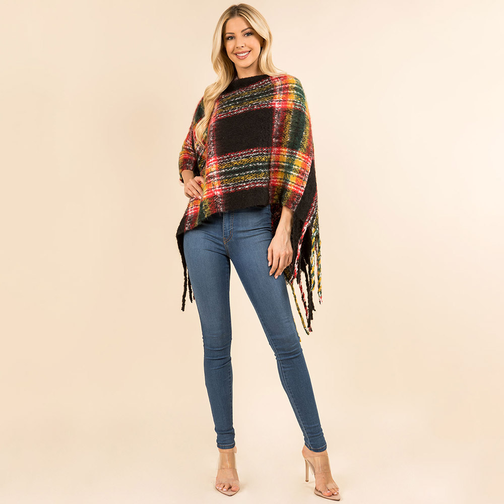 Details • Size : One Size • Material : 100% Acrylic • Stay cozy and stylish with this plaid poncho featuring a soft textured feel and dramatic fringe hem. Perfect for layering over any outfit, it adds instant warmth and timeless elegance to your fall and winter wardrobe.