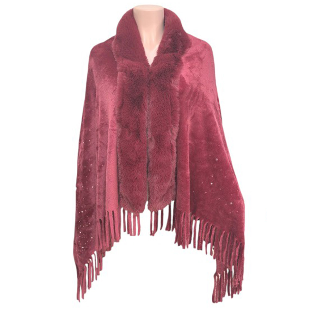 Rhinestone Embellished Fringe Faux Fur Poncho Wrap