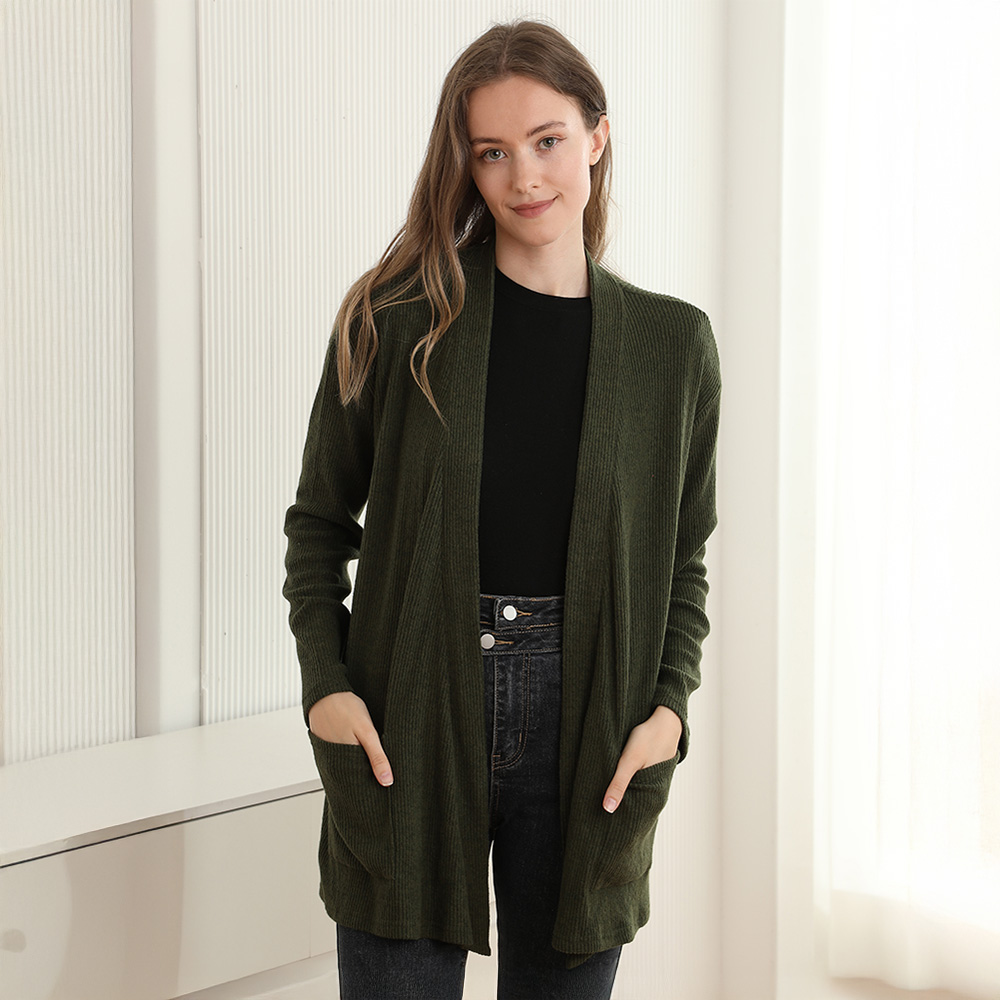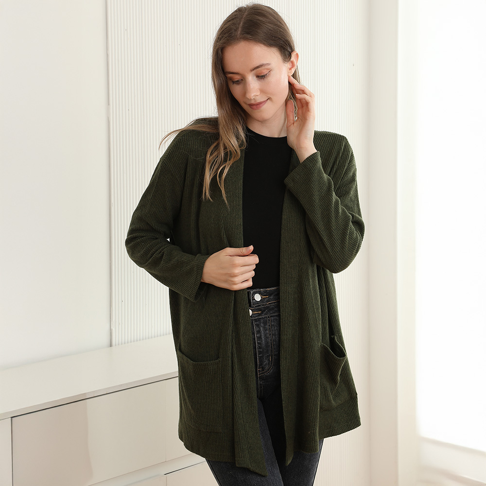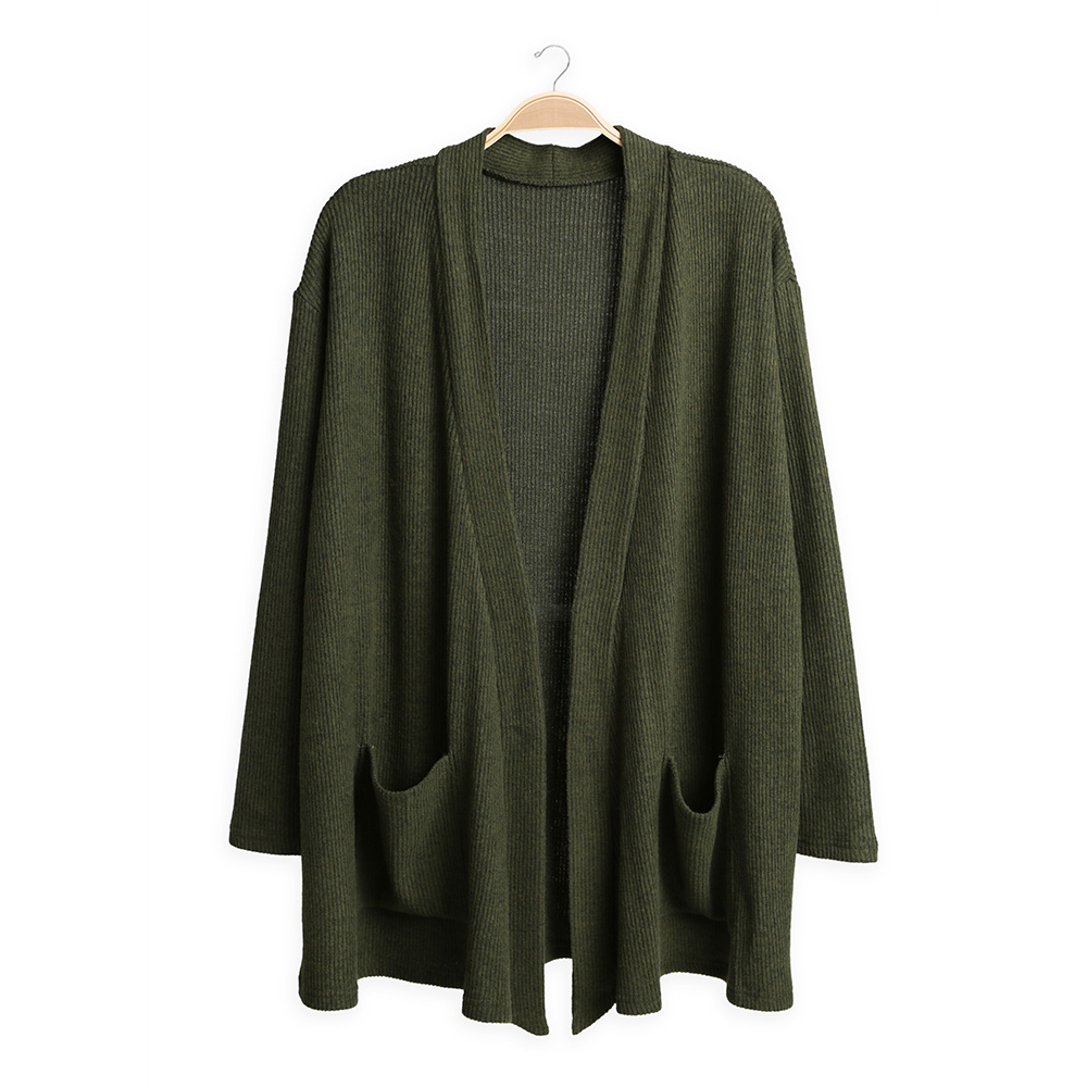 Solid Color Knit Ribbed Open Front Cardigan with Pockets