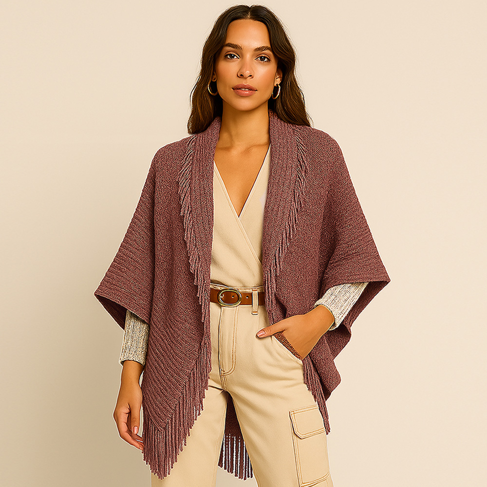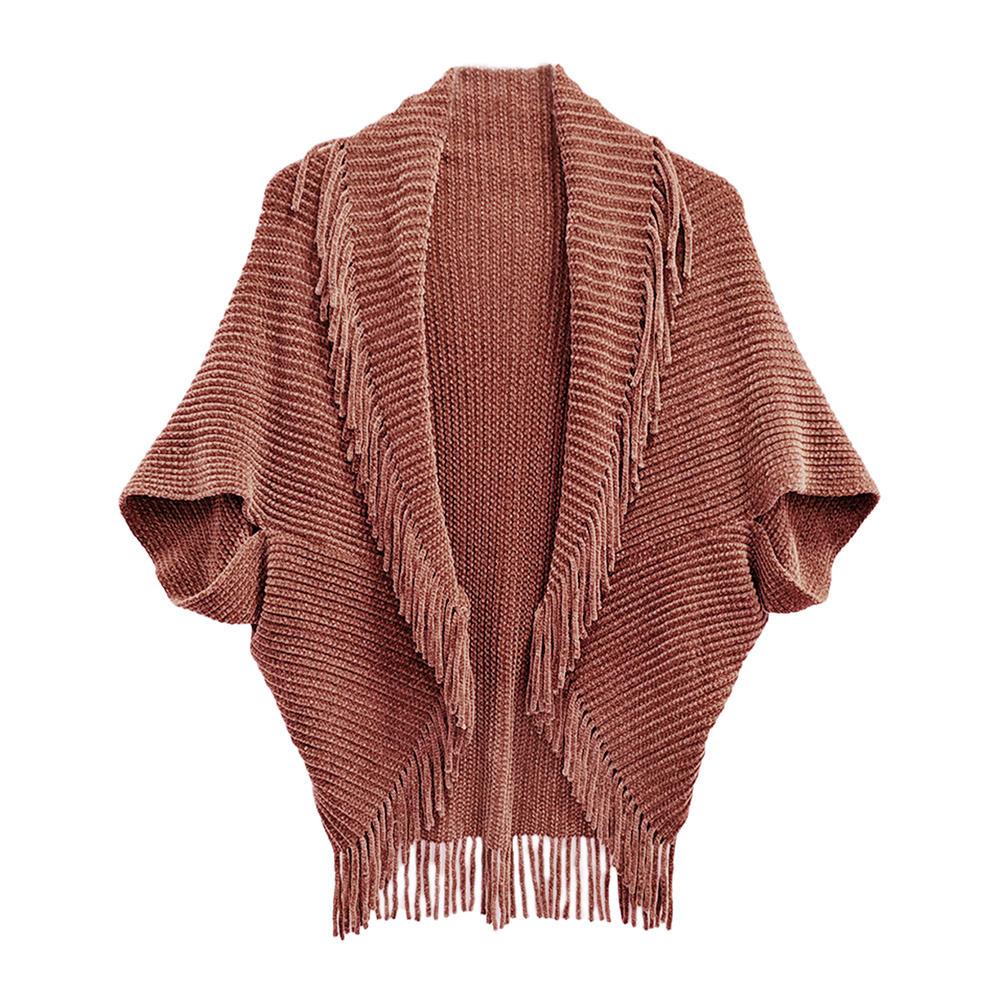 • Stay cozy and stylish with this knitted shawl featuring a chic fringe trim. Its open front design and relaxed fit make it perfect for layering over any outfit. Versatile and comfortable, this shawl adds a touch of boho charm to casual looks while keeping you warm and fashionable.