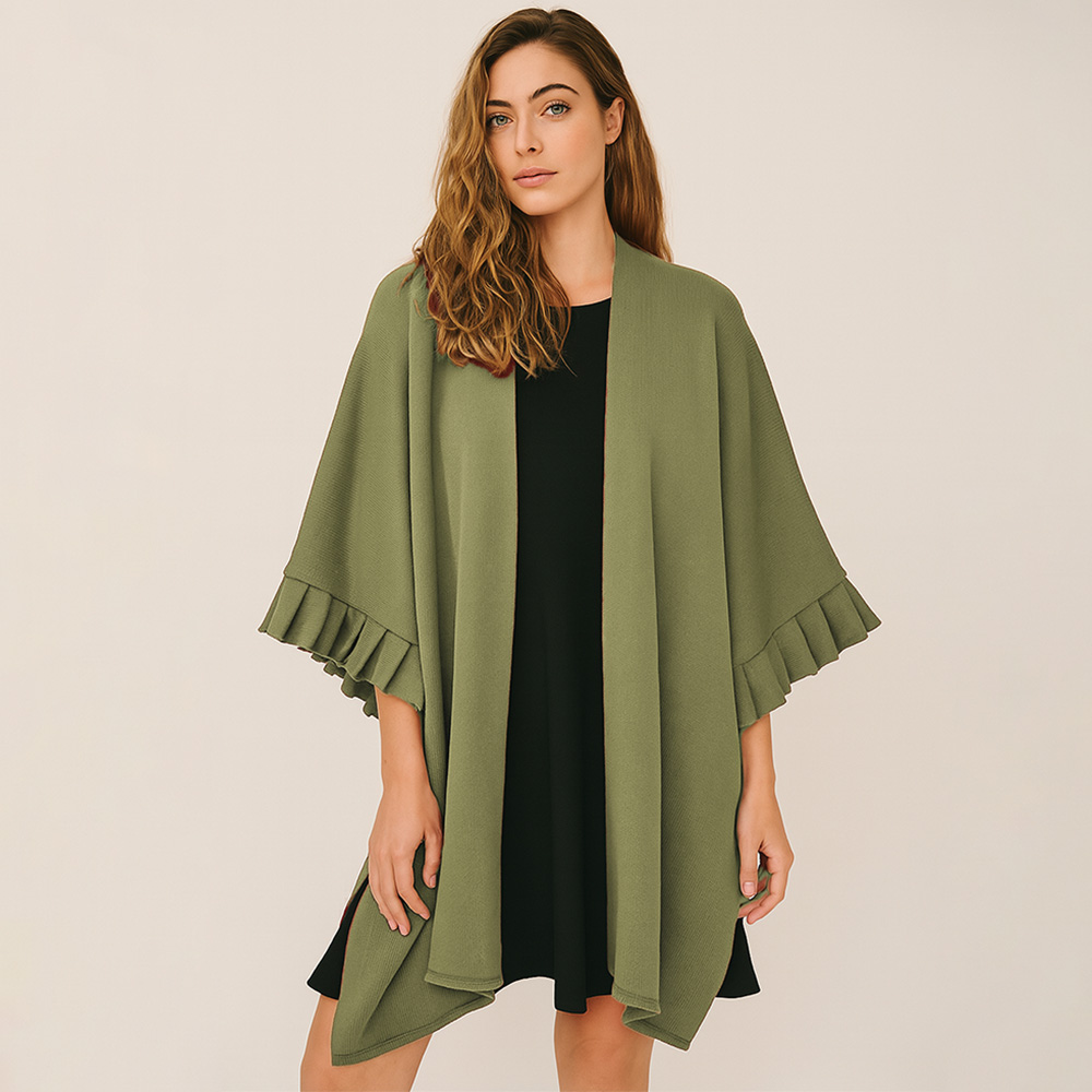 • Enhance your style with this open front cape featuring elegant ruffled sleeve details for a modern touch. Its relaxed fit and flowing silhouette make it a versatile layering piece, perfect for casual or dressy looks, offering comfort and sophistication for any occasion or season.