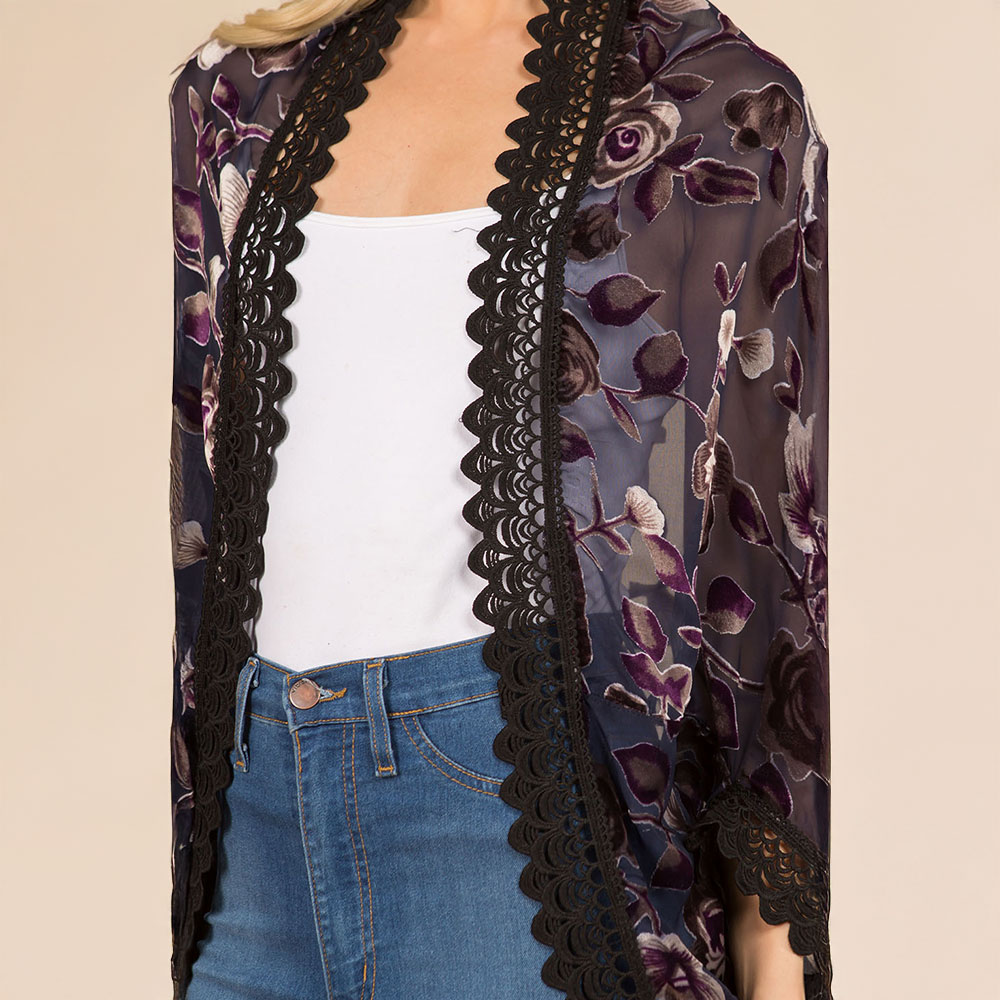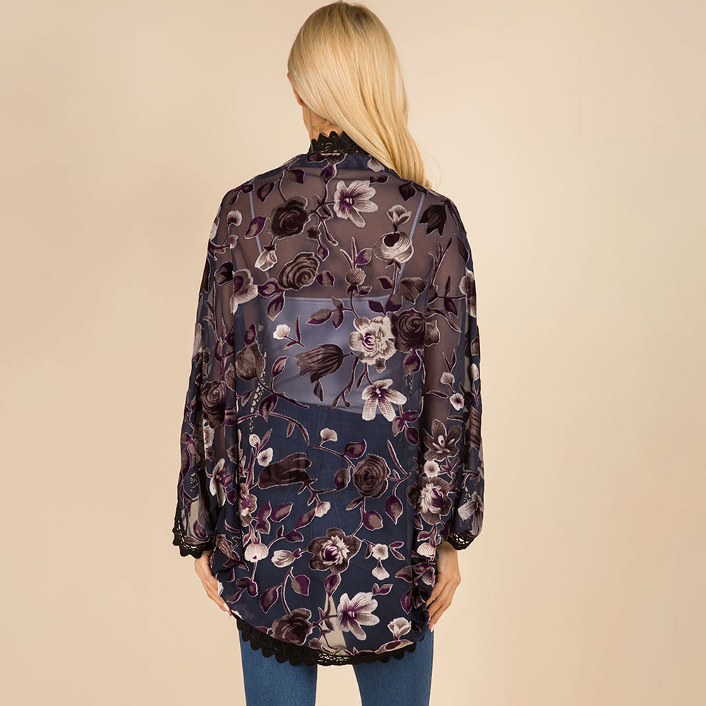 Scalloped Lace Trim Open Front Burnout Floral Print Kimono Wrap Poncho