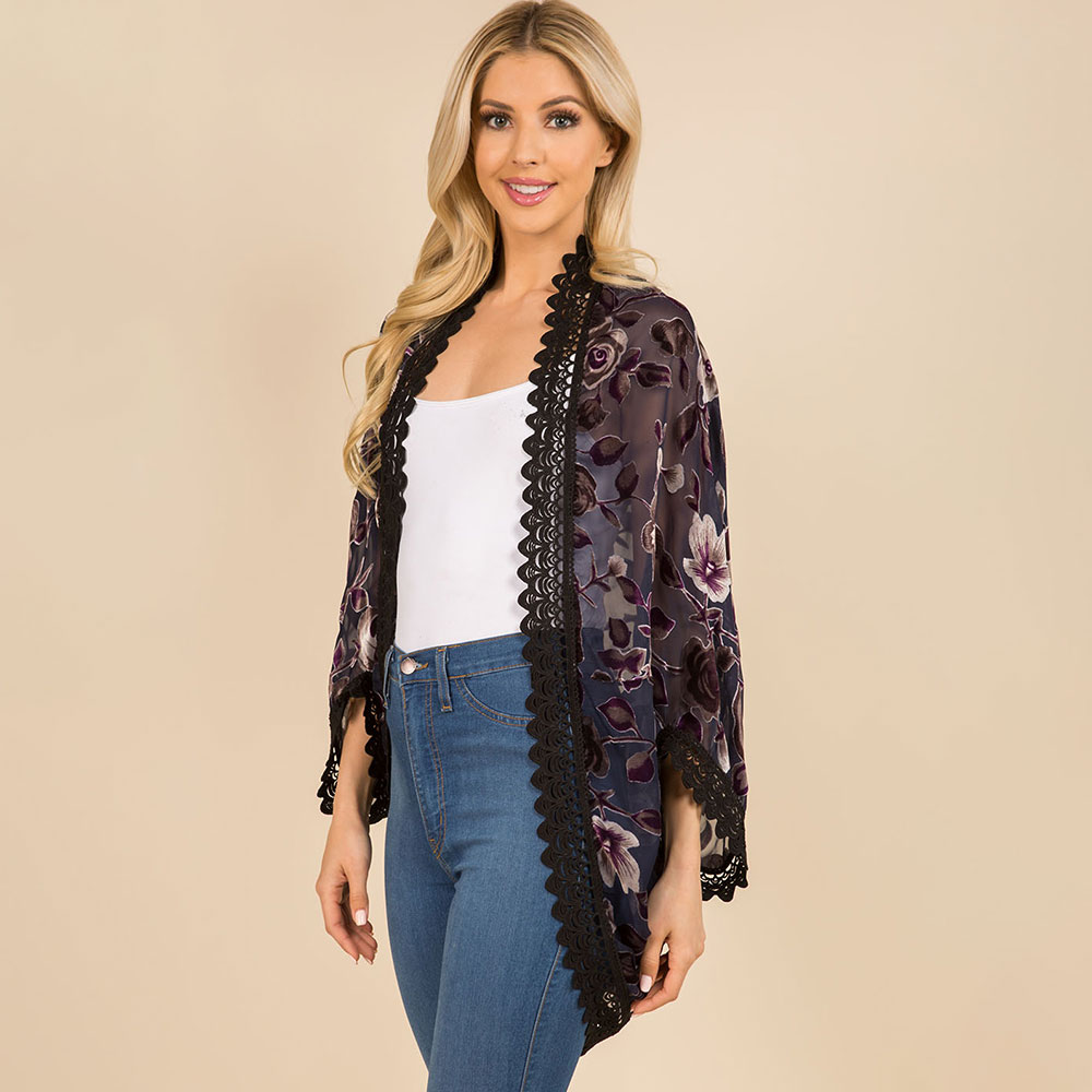 Details • Size : One Size • Material : 100% Polyester • Enhance any outfit with this elegant kimono wrap featuring delicate floral patterns and detailed lace trim. Its open-front design and relaxed fit offer effortless layering for both casual and sophisticated looks.