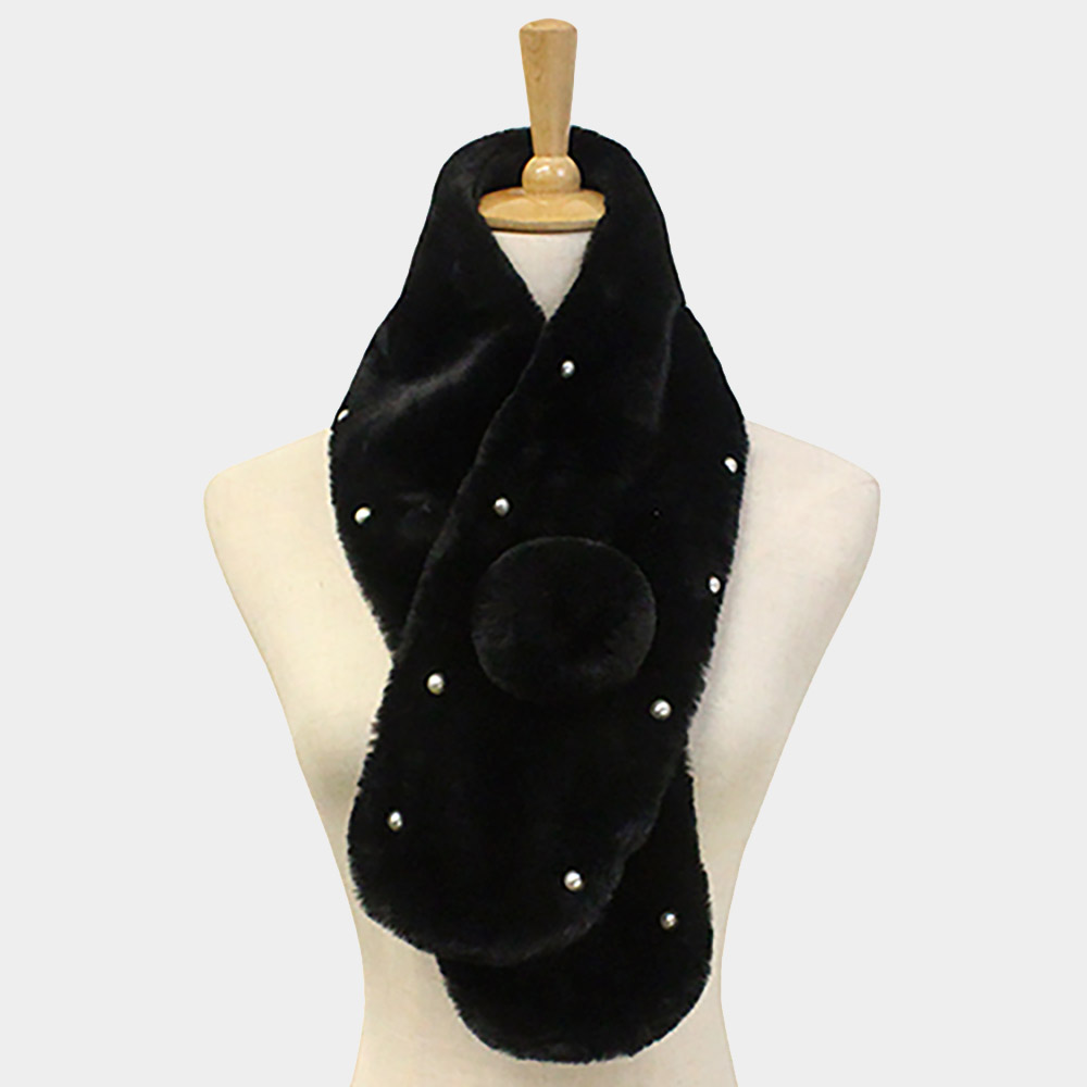 Pearl Embellished Faux Fur Pom Pom Pull Through Scarf Pearl Embellished Faux Fur Pom Pom Pull Through Scarf