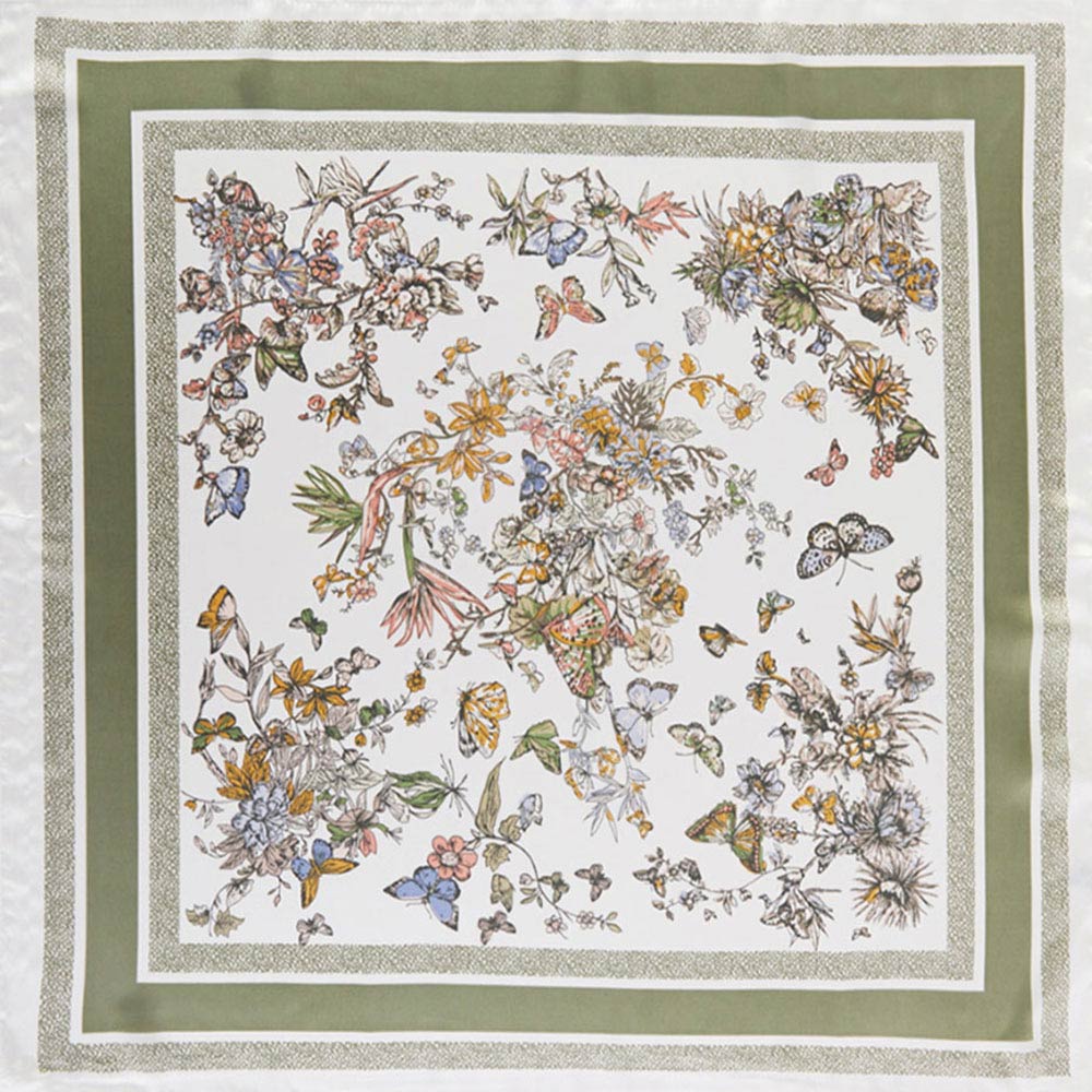 • Float into style with this exquisite square scarf, featuring a dense, beautiful print reminiscent of Chinoiserie or toile designs. The pattern is filled with delicate butterflies and lush, detailed floral bouquets primarily in beautiful shades of blue and white, framed by a striped border. Made from a smooth, satin-feel fabric, this elegant accessory adds a layer of intricate beauty and sophistication to any look.