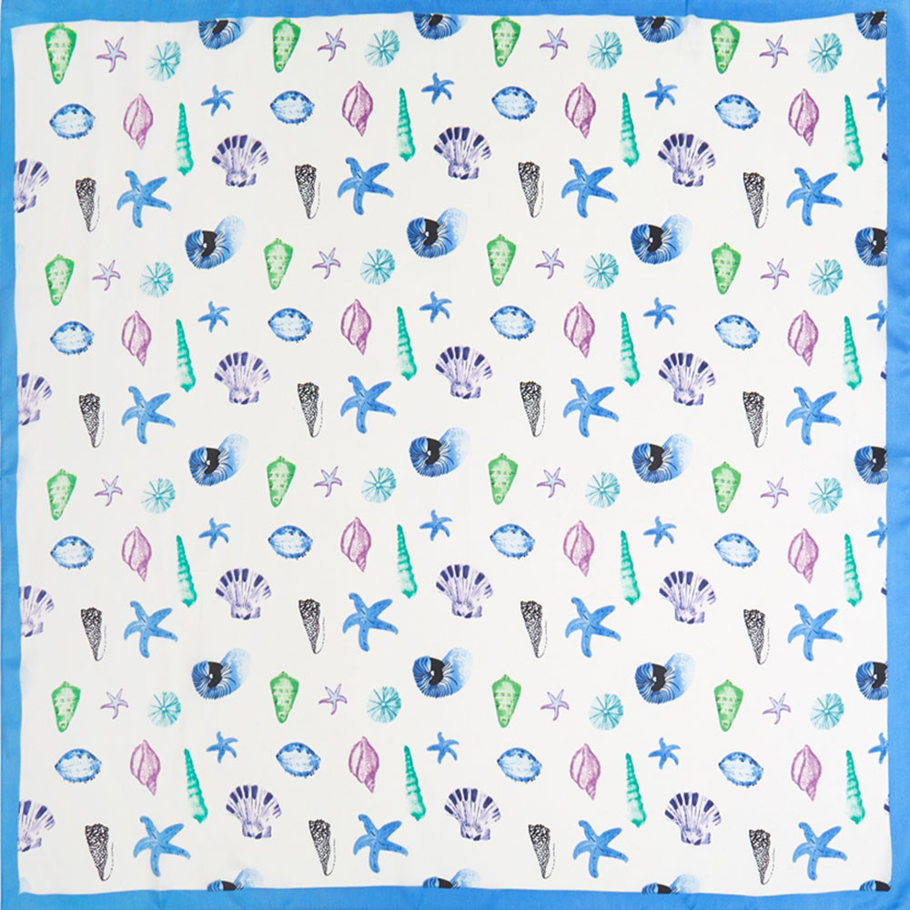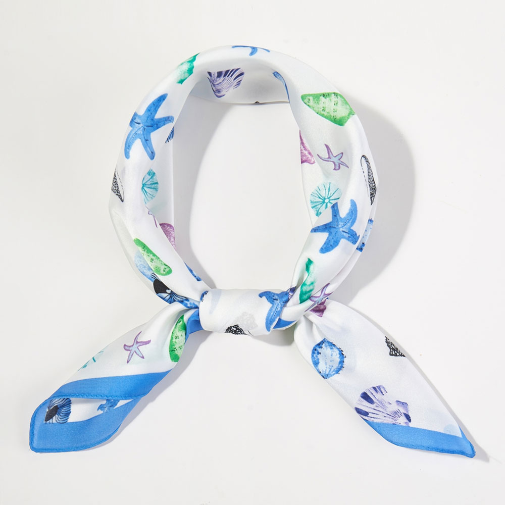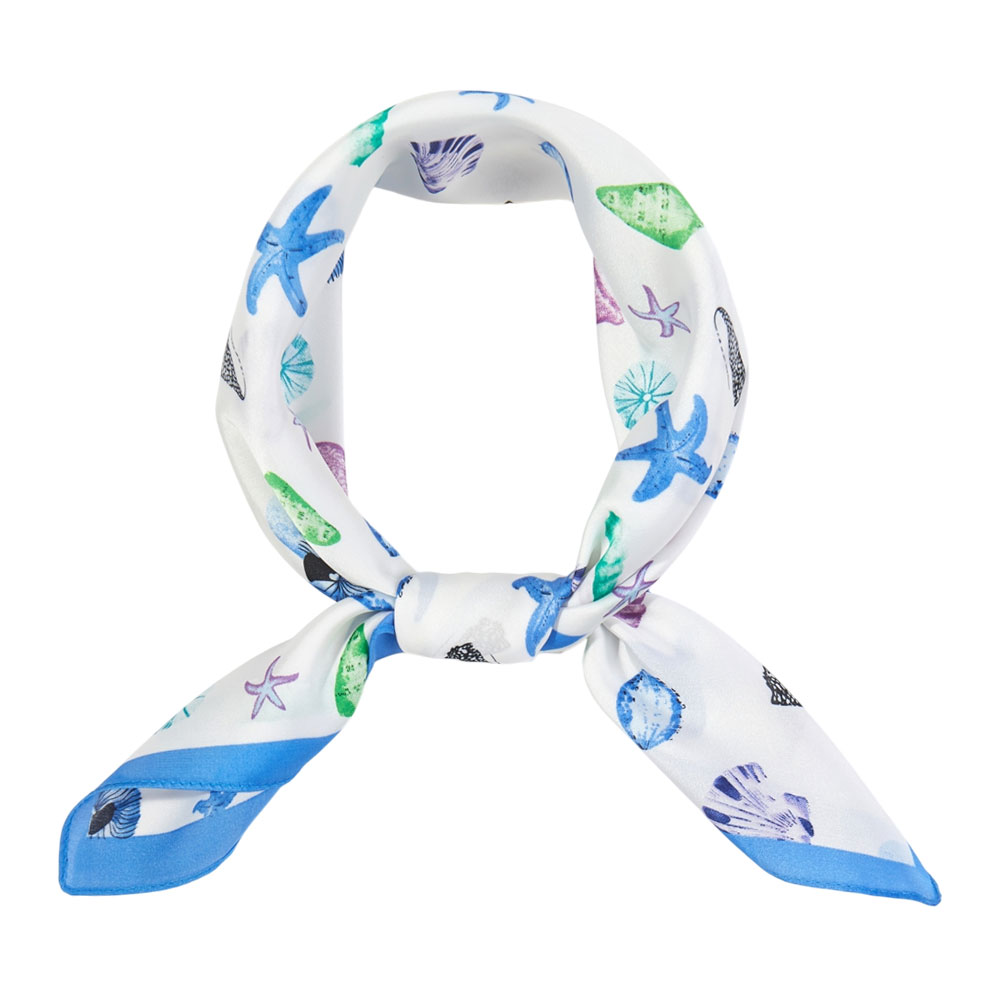 • Bring ocean-inspired charm to any outfit with this coastal print square scarf featuring playful starfish, seashells, and sea-treasures in cool blue and green tones. Designed with a bright blue border, it’s perfect for styling as a neck scarf, hair accessory, or handbag tie. A fun beach-day accent that adds breezy summer vibes to casual and vacation looks.