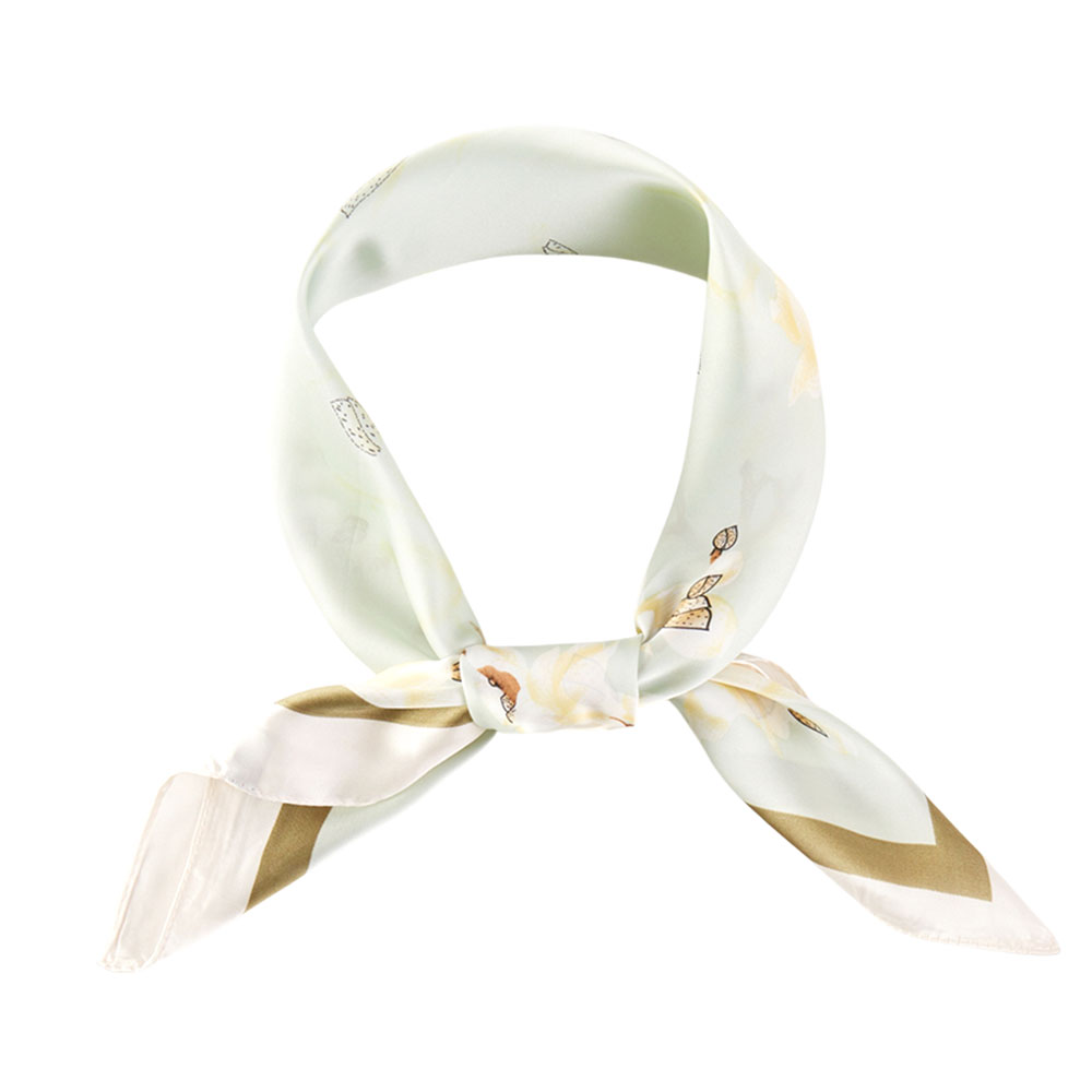 • Elevate your look with this serene and sophisticated square scarf. The design showcases a beautiful, delicate print of blossoming floral clusters on branching stems, creating an overall soft and ethereal aesthetic. Crafted from a smooth, satin-feel fabric, this versatile accessory drapes gracefully, adding a touch of gentle texture and refined pattern to any ensemble, whether worn around the neck, in the hair, or tied to a bag handle.