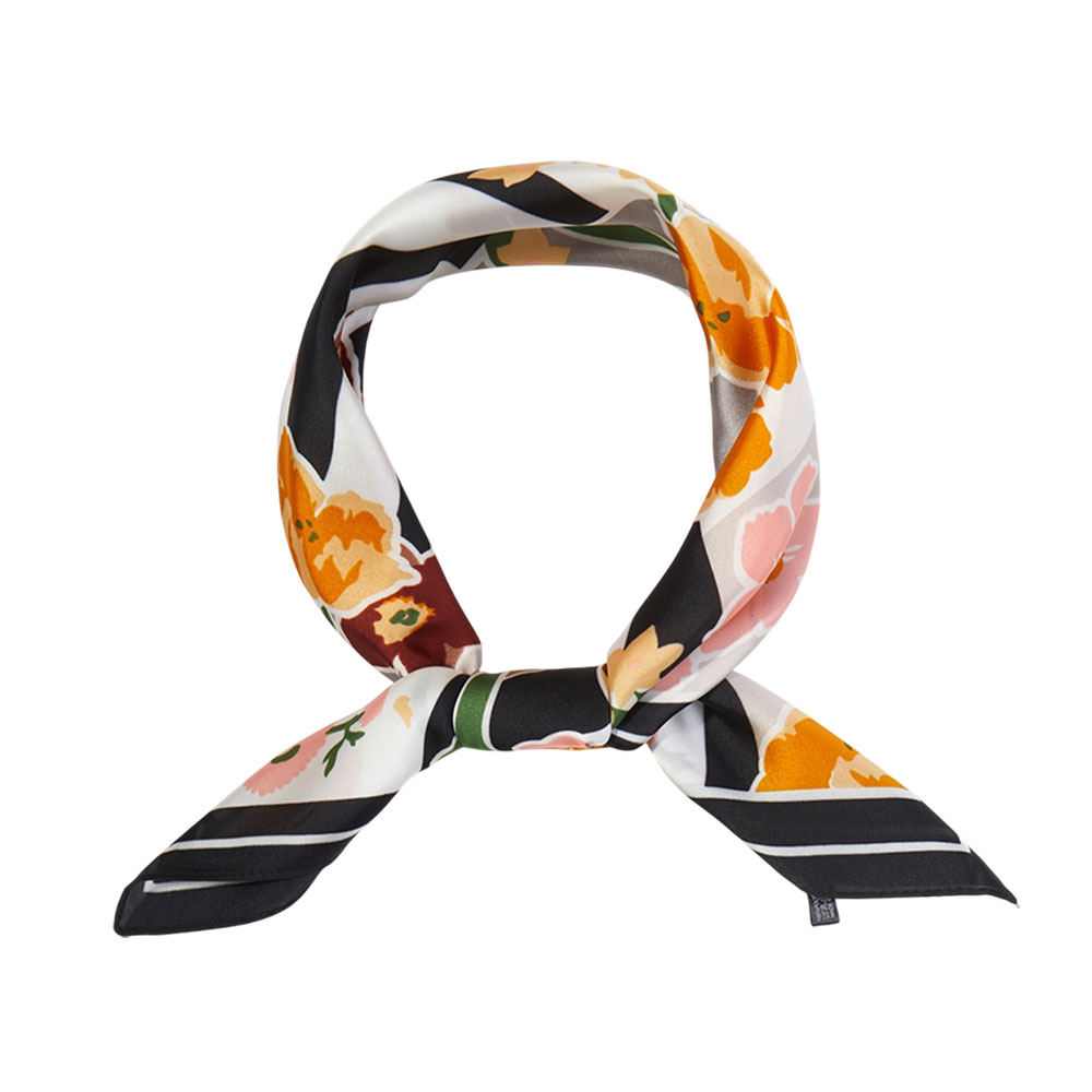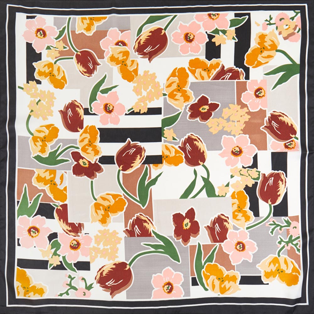 • Add a chic statement to your wardrobe with this square scarf featuring a bold mix of floral and geometric motifs. Its versatile design complements both casual and polished looks, making it ideal for wearing around the neck, in the hair, or as a stylish accessory on bags.