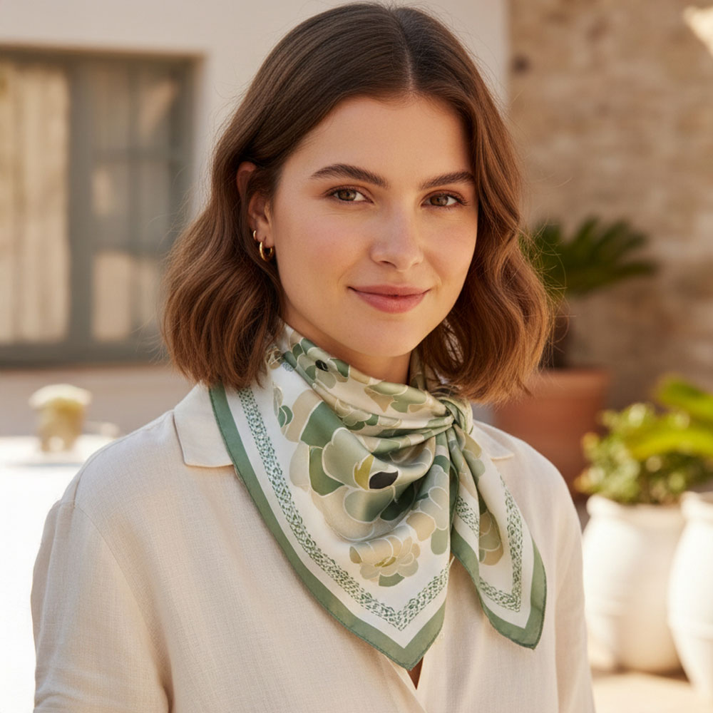 • Enhance your wardrobe with this beautiful floral square scarf featuring a soft garden-inspired design and a stylish bordered edge. Versatile and lightweight, it can be worn as a neck scarf, hair wrap, headband, or tied to a handbag for a chic finishing touch. Perfect for casual wear, work outfits, or special occasions, offering a timeless and refined accessory option.