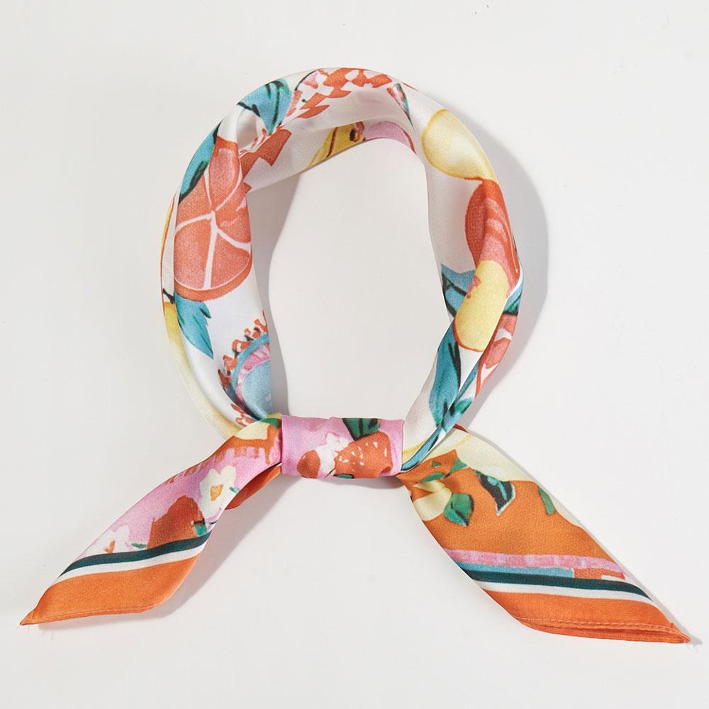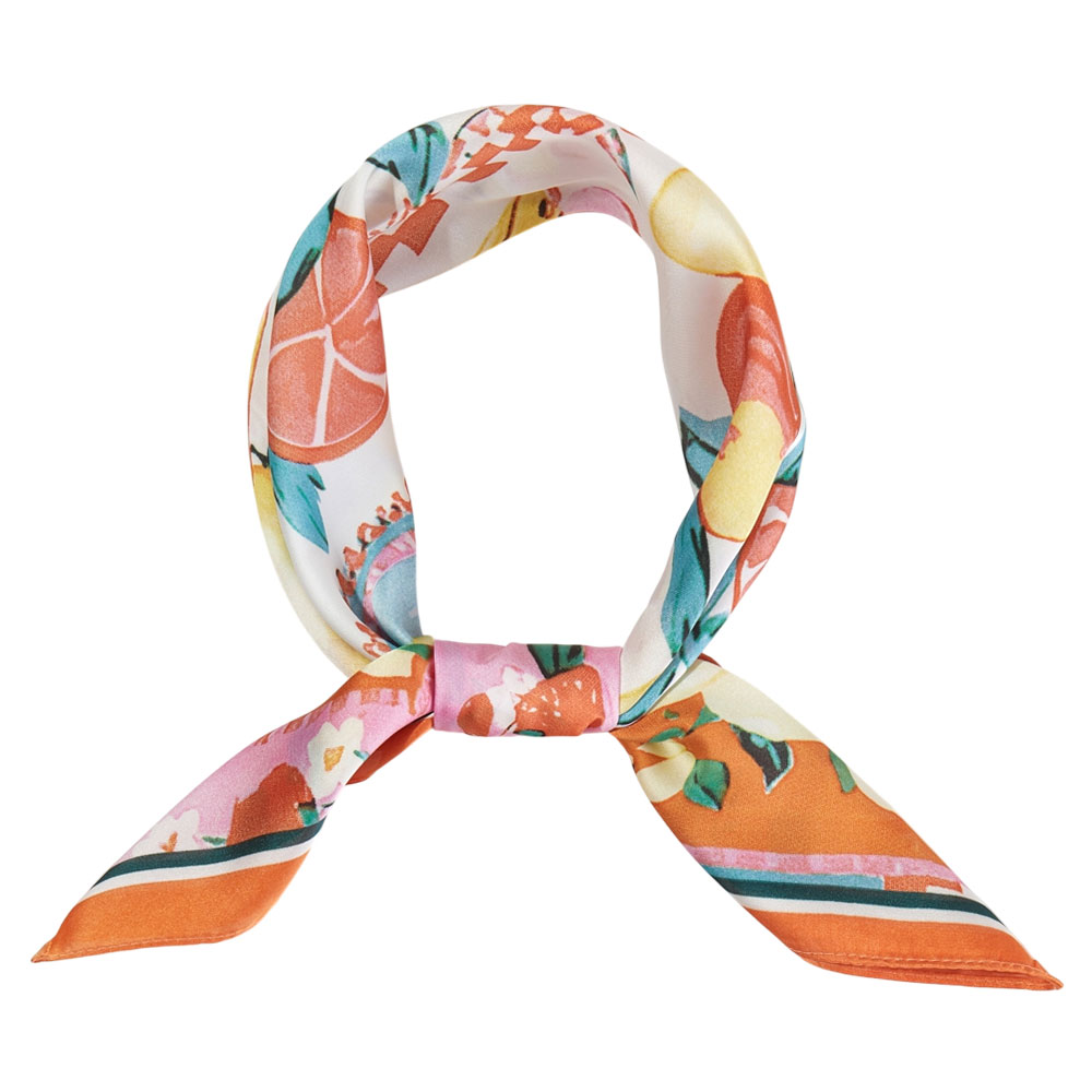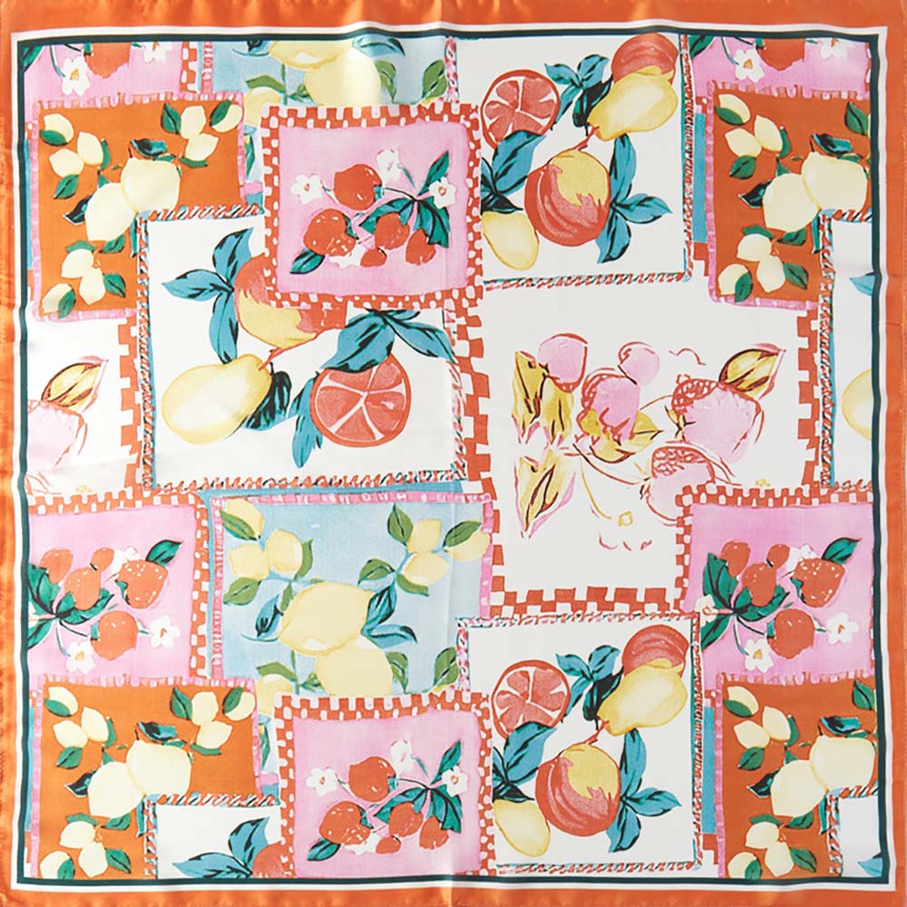 Details • Size : 27.5" X 27.5" • Material : 100% Polyester • Refresh your look with this vibrant fruit print scarf featuring lively lemons, oranges, and botanicals on a patchwork design. This lightweight square scarf adds a playful pop of color to any outfit. Style it as a neck scarf, hair wrap, handbag accent, or summer accessory. Perfect for bright, sunny days and fun seasonal outfits, making your wardrobe instantly more cheerful and stylish.