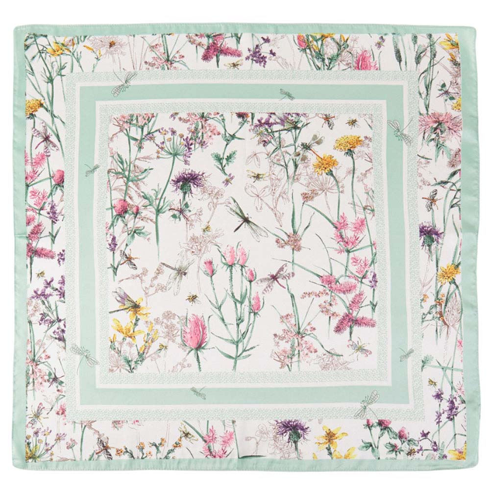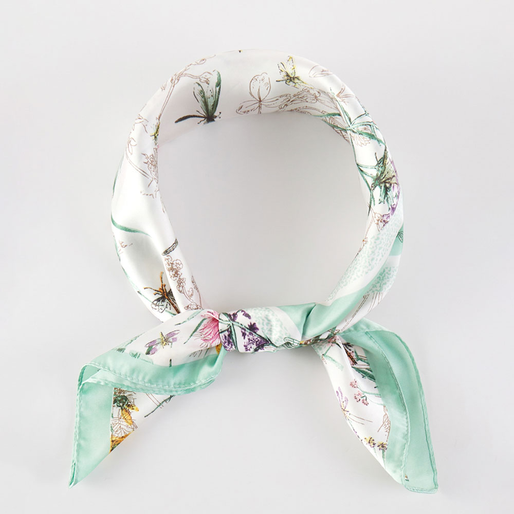 Details • Size : 27.5" X 27.5" • Material : 100% Polyester • This square scarf showcases a delicate botanical pattern that adds an elegant, nature-inspired touch to any outfit. Its lightweight design makes it perfect for styling as a neck wrap, hair accessory, or bag accent, bringing subtle charm and versatility to everyday looks.