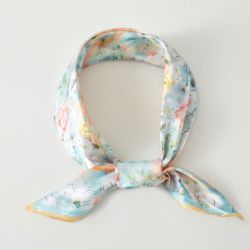 Details • Size : 27.5" X 27.5" • Material : 100% Polyester • This square scarf showcases a dreamy watercolor floral pattern that adds an elegant, artistic touch to any outfit. Its lightweight feel and versatile design make it perfect for styling as a neck scarf, hair accessory, or handbag accent, enhancing everyday looks with effortless charm.