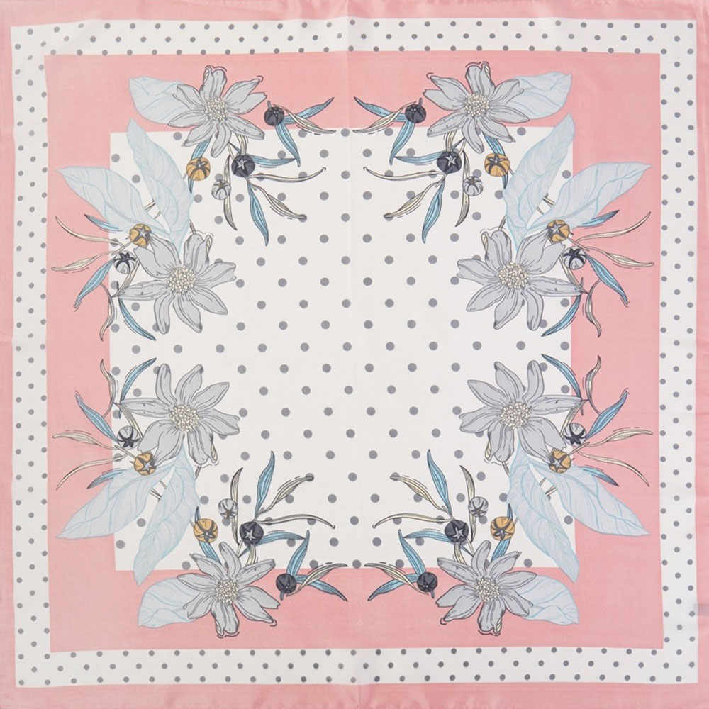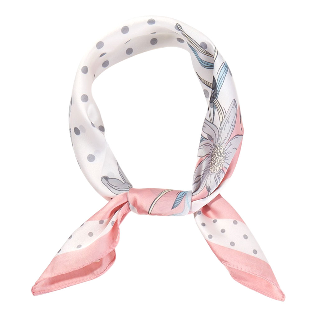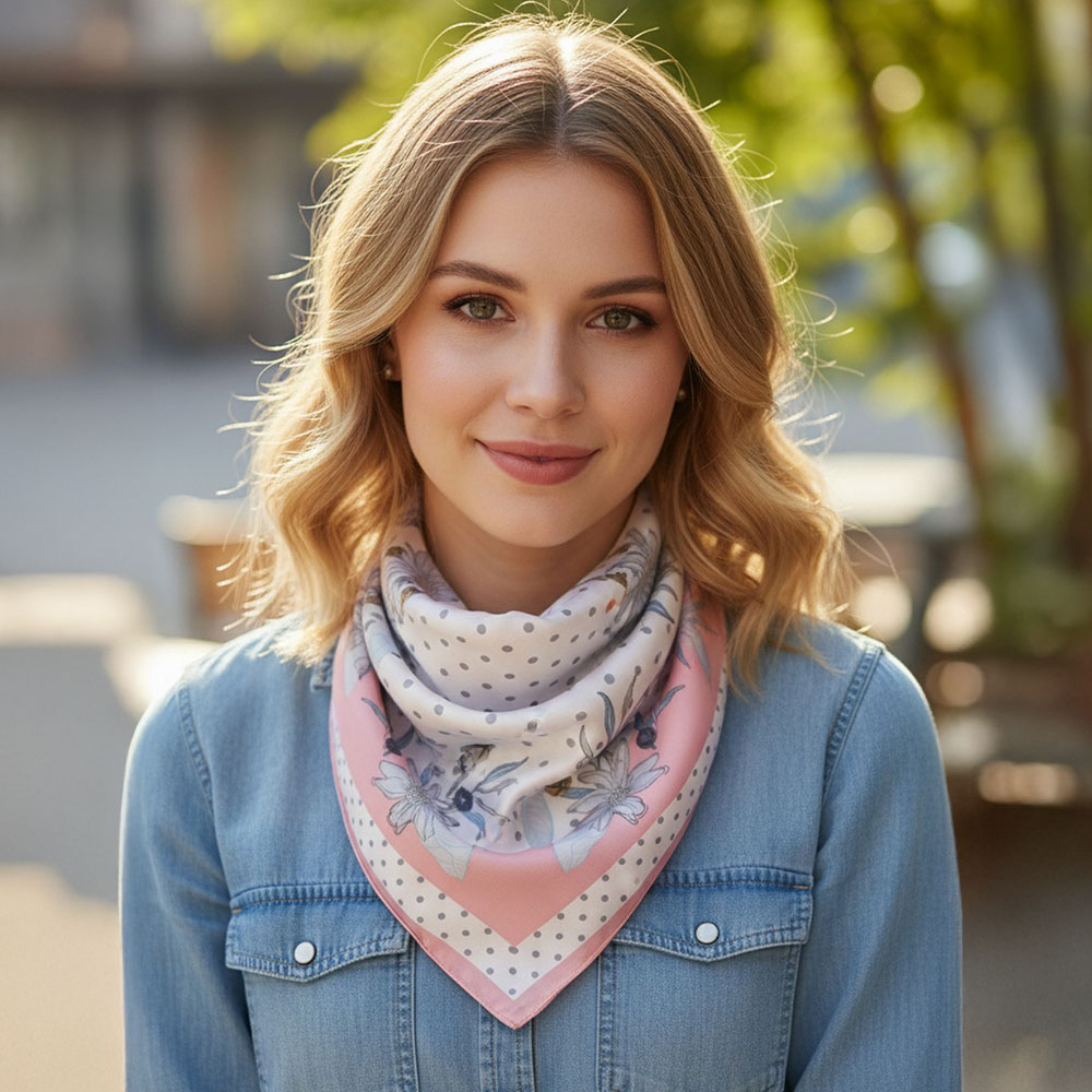 Details • Size : 27.5" X 27.5" • Material : 100% Polyester • Elegant square fashion scarf featuring a floral border with classic polka dot detailing. Designed for versatile styling around the neck, hair, handbag, or wrist, this timeless accessory adds a refined, feminine accent to everyday looks, seasonal outfits, and curated boutique collections.