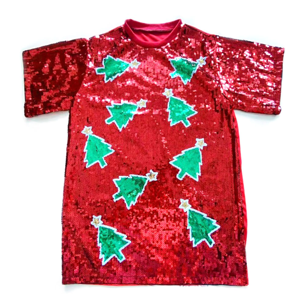 Details • Size : One Size • Bust Size : 42" - 45" L, Length : 30" L • Material : 100% Polyester • Sparkle with seasonal charm in this plus size sequin Christmas tree dress, featuring playful holiday motifs and a shimmering finish. Perfect for Christmas parties, family gatherings, or festive photos, this cheerful dress brings joy and holiday spirit to every celebration.