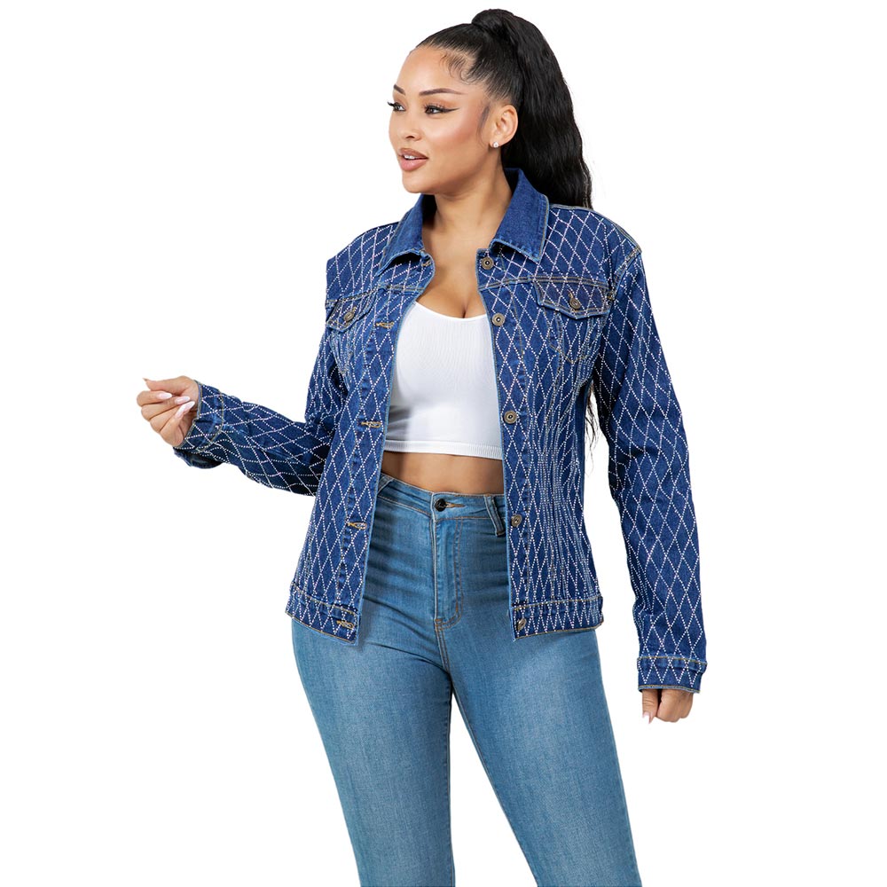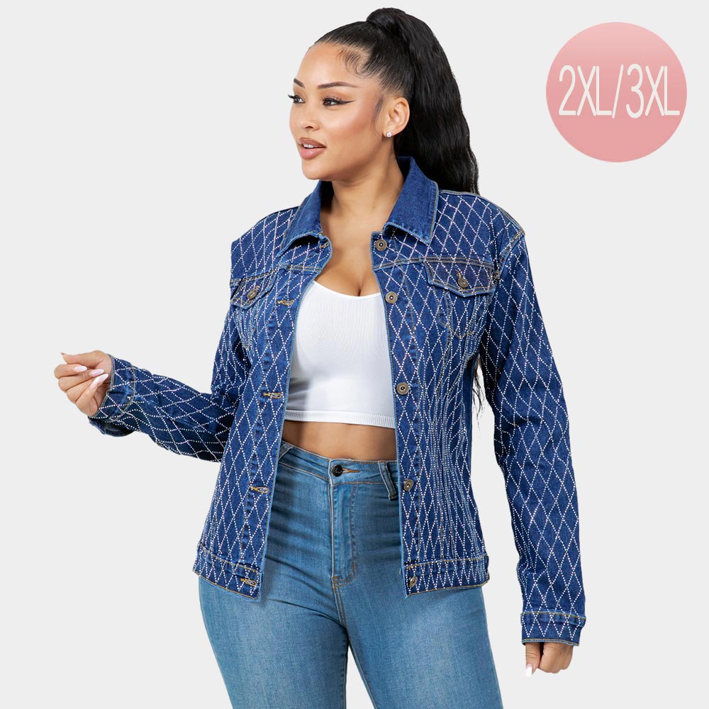 Details • Size : 2XL/3XL • Material : 67% Cotton, 20% Polyester, 11% Rayon, 2% Spandex • Step out in style with this eye-catching rhinestone studded denim jacket featuring a classic button-up design. Perfect for casual outings or elevated streetwear looks, it combines sparkle and structure in one chic piece. It's perfect for both day and night. Features functional front pockets, full-length sleeves, and a flattering tailored fit that pairs effortlessly with jeans or leggings.