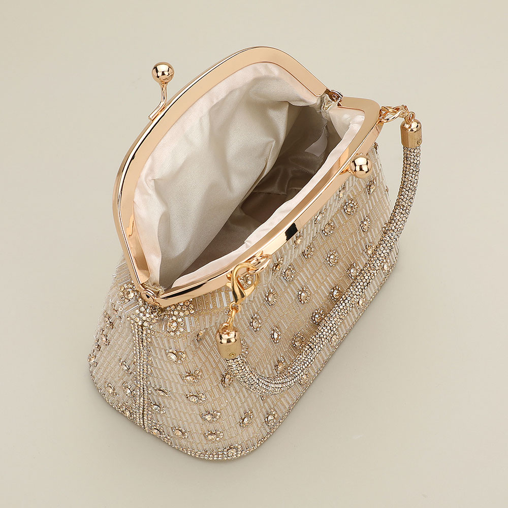 Details • Size : 7.5" X 6" X 4" • Strap Size : 46" L / Detachable • Clasp Closure • Discover a refined evening handbag featuring intricate embellishments, a structured frame, and a sparkling top handle designed for timeless sophistication. Its secure clasp and smooth interior offer both elegance and practicality for special occasions.